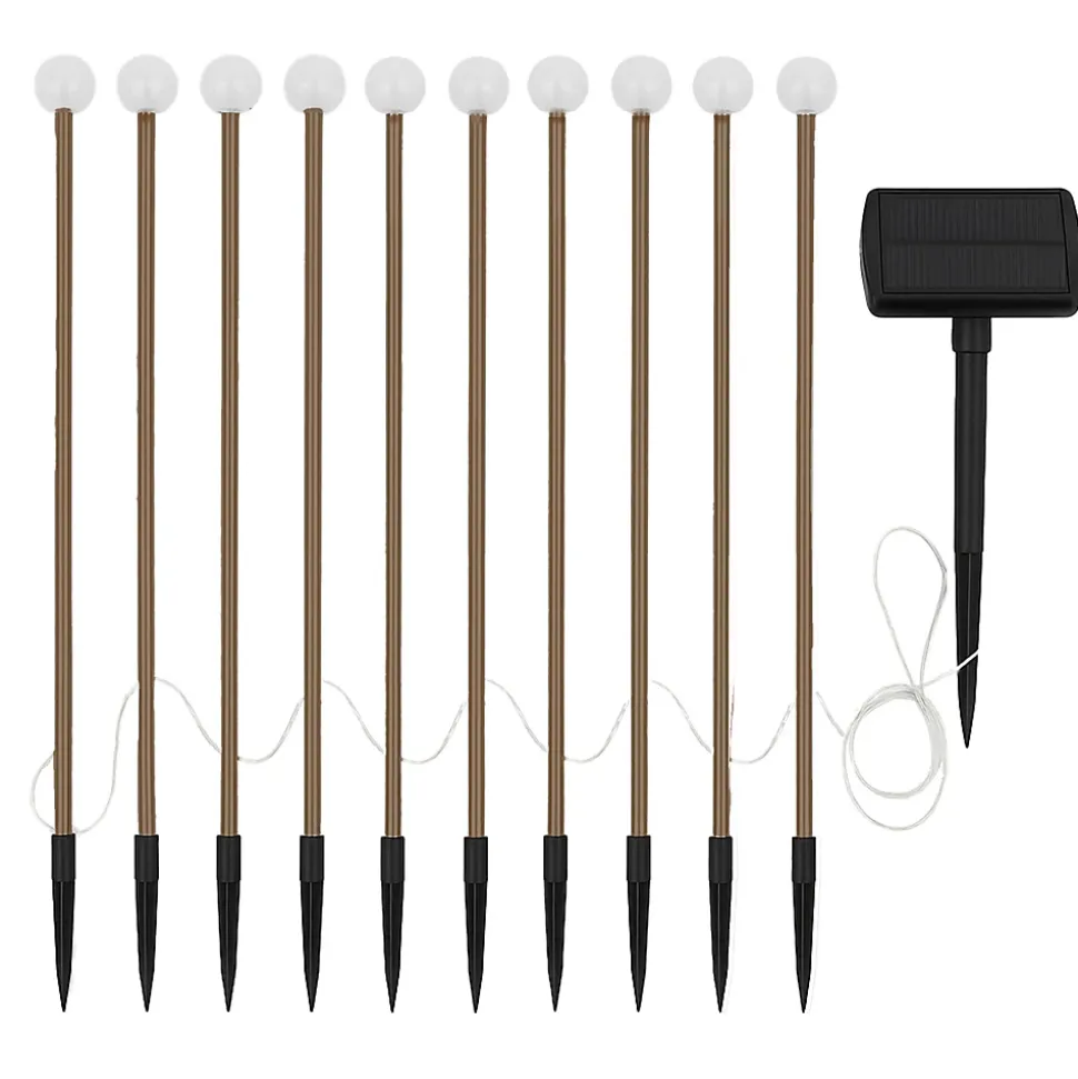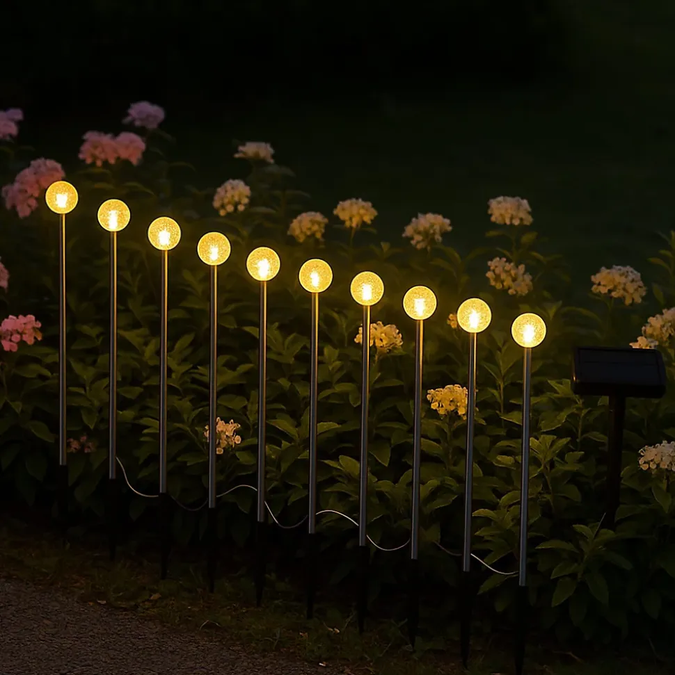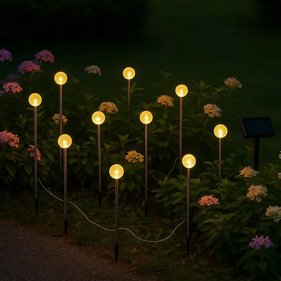 Illuminez votre jardin avec les 10 mini-boules solaires à piquer Lolly diffusant une lumière blanc chaud scintillante. Chaque unité de 40 cm de hauteur est reliée à un panneau solaire central, permettant un fonctionnement autonome sans aucun raccordement électrique fixe. Leur batterie assure une autonomie technique de 8 heures après 4 à 6 heures de charge solaire quotidienne chaque jour. Les balises s’activent automatiquement dès la nuit tombée pour créer une ambiance féerique le long de vos allées. Certifiées IP44, elles sont protégées contre les intempéries et les rayons UV saison après saison. L’ensemble mesure 5 mètrès de longueur totale pour structurer vos massifs avec élégance. Pour un effet encore plus chaleureux, combinez-la avec d’autres sources de lumière et variez les hauteurs d’installation.