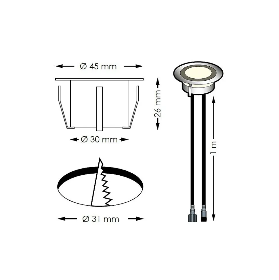 SOFIA : SPOT LED À ENCASTRER DIAMÈTRE 45MM – COULEUR RGBLe kit de spots SOFIA RGB comprend les éléments suivants :10 Spots de couleur (RGB) : avec télécommande RGB Ref HEL011 et transformateur inclus.Chez Owlia, nous garantissons nos produits pendant 3 ans, et les spots ont une durée de vie impressionnante de 50 000 heures, assurant ainsi d’innombrables soirées en famille ou entre amis.La couronne extérieure est en Inox 304. Pour prévenir l’apparition de légères traces de rouille en surface, un entretien régulier est nécessaire.INSTALLEZ TRES SIMPLEMENT LE KIT SOFIA EN MODE PLUG & PLAYChaque spot est équipé de deux câbles de 1 mètre, que vous pouvez connecter les uns aux autres en quelques minutes. Cette technologie garantit la protection IP67, donc évitez de serrer trop fort les connexions. Des détrompeurs sont également présents sur chaque prise pour éviter toute erreur d’installation.Nous vous recommandons de dessiner un plan pour visualiser votre circuit et identifier d’éventuelles contraintes. Si nécessaire, utilisez des rallonges pour faciliter l’installation. Pour percer vos lames, respectez le diamètre indiqué : 31 mm. Les câbles ont un diamètre de 5 mm et les raccords de 15 mm.CARACTÉRISTIQUES TECHNIQUESDiamètre (Ø) : 45mmCouleur LED (Kelvin) : RGB CouleurDiamètre de perçage (Ø) : 31 mmGarantie : 3 ansLongueur de câble : 2 x 1mIsolation : IP67Durée de vie LED (h) : 50 000Source lumineuse remplaçable : nonClasse énergie LED : A+Matériau de la plaque : PolycarbonateVoltage : 12VInstallation : Plug and PlayMatériau du corps : INOX (304)Nombre de spots max par installation : 20Ø câble / Ø raccord câble : 5mm – 15mmWatt : 0.5Lumen : 12Transformateur : Oui