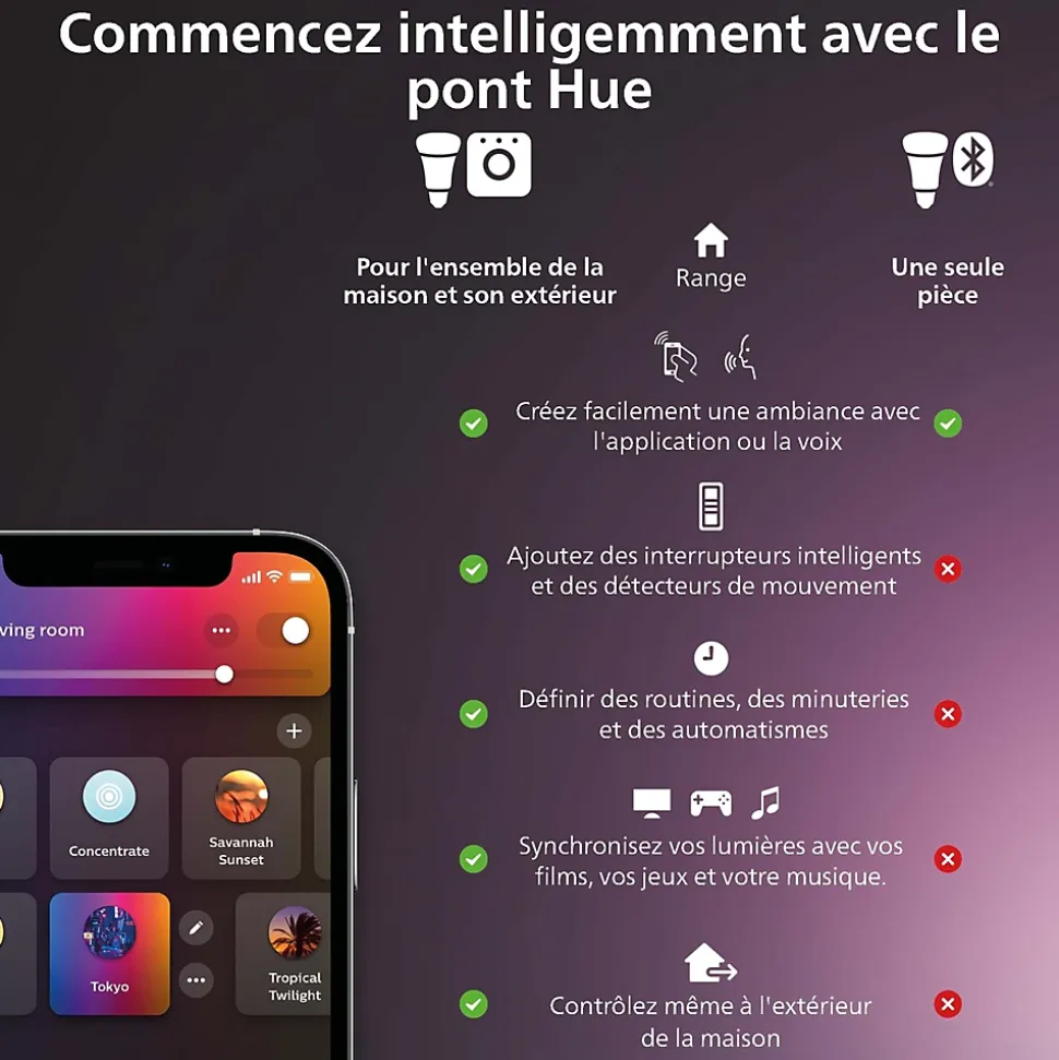 - Une envie de simplement créer une ambiance ? Commencez avec l’application Philips Hue Bluetooth et connectez jusqu’à 10 ampoules. Personnalisez votre ambiance grâce aux 16 millions de couleurs.