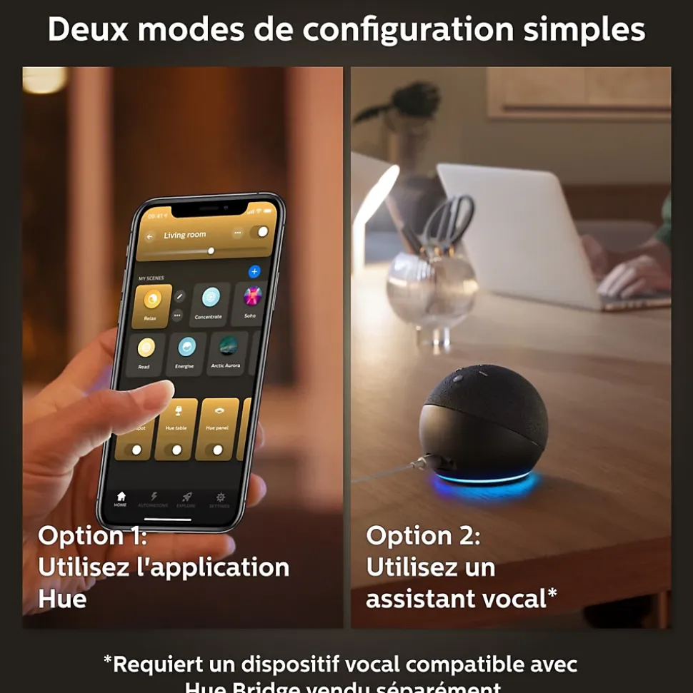 - Ajoutez le pont Hue (non fourni) et étendez votre éco-système en connectant jusqu’à 50 points d’éclairage tout en bénéficiant de fonctionnalités supplémentaires (gestion à distance, routines).