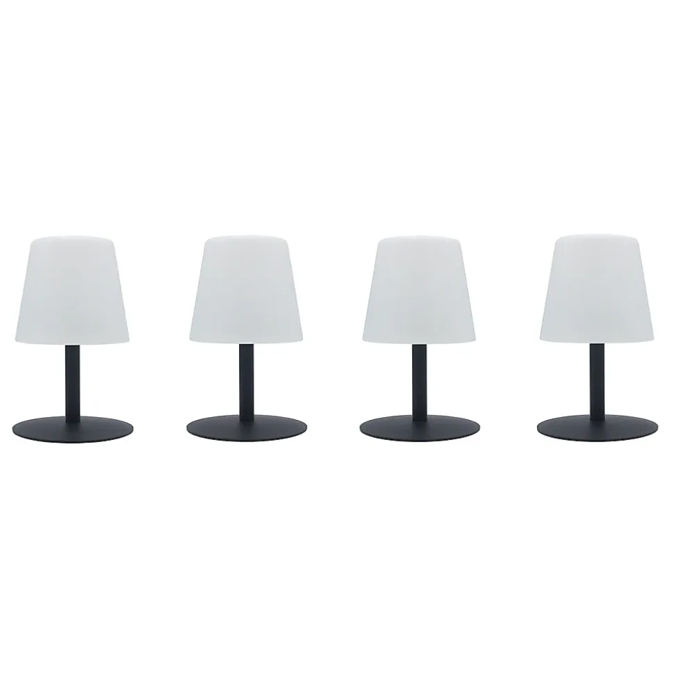 Le Lot de 4 Lampes de Table LED Sans Fil Standy Mini Rock offre une solution d’éclairage nomade au design moderne avec pied en acier gris brossé. Ces 4 lampes autonomes apportent une touche originale à votre décoration intérieure ou extérieure. Équipées d’une base LED blanc chaud/froid à intensité variable, elles proposent un flux de plus de 100 lumens adaptable. Leur batterie rechargeable offre une autonomie de 8 heures après une charge de 4 à 6 heures par câble USB. L’abat-jour en polyéthylène ø16x H25cm est certifié IP44 pour résister aux éclaboussures et aux rayons UV, idéal pour la terrasse ou les tables de fêtes. Profitez d’un éclairage nomade fiable avec une grande facilité d’entretien à l’eau tiède et au savon doux. Facile à intégrer à votre aménagement, elle apporte un point lumineux décoratif sans alourdir l’espace. Pour un effet encore plus chaleureux, combinez-la avec d’autres sources de.