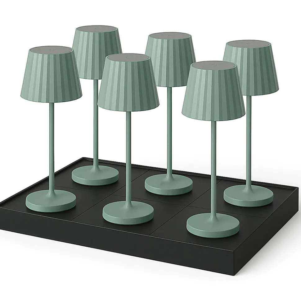 Sublimez vos réceptions avec ce lot de 6 lampes de table sans fil Abby Olive au coloris vert olive très actuel. Chaque lampe en aluminium offre une silhouette fine avec un abat-jour de 11 cm de diamètre et une hauteur de 29 cm, alliant robustesse et esthétisme naturel. Le plateau de chargement multiple par contact inclus permet de recharger simultanément les 6 unités sans aucun câble gênant, garantissant une autonomie de 7 heures après seulement 2 heures de charge. Avec un flux de 230 lumens et un variateur d’intensité tactile sur chaque lampe, vous créez une ambiance conviviale et sur mesure pour vos convives en pressant simplement le bouton on/off. Certifiées IP65, elles sont totalement étanches aux éclaboussures et aux poussières, ce qui les rend parfaites pour un usage professionnel intensif en terrasse de restaurant ou au jardin sans aucun fil apparent sur vos tables pour une présentation soignée.