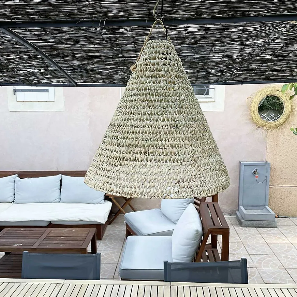 Abat jour pour Lustre conique en fibres de palmier « Doum » du Maroc tressée Une forme conique très tendance pour ce lustre Marocain faite à la main. Elle allie le savoir-faire artisanal marocain et l’authenticité de ces luminaires traditionnels. Elle s’intègre parfaitement dans un salon ou une chambre très adaptée aux intérieurs naturel et bohème. Ces abats jours pour suspensions sont produits en petite série au Maroc par des artisans passionnés. Ils sont faits à partir de fibres de palmiers tressés si caractéristique de la tendance bohème chic. Leur utilisation est idéale en intérieur, prévoir une monture E27 avec une ampoule LED et un petit crochet (non inclus). Ces luminaires se positionnent aussi en extérieur avec une installation électrique adaptée et étanche (la paille résiste sans problème à l’eau). A positionner dans un salon, une cuisine, une chambre… En été on les aime aussi sous nos terrasses et pergolas (abritées) pour donner un air bohème chic à nos jardins. Dimensions : Diamètre 45cm et Hauteur 50cm. Chaque pièce est unique et fabriquée artisanalement au Maroc, les dimensions peuvent varier légèrement. Luminaires en paille fabrication à la main>> Voir tous nos lustres en paille