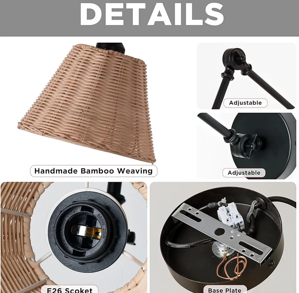 Applique murale “Raul” – Bras oscillant avec abat-jour en rotin naturel, style rustique industriel, câble avec prise et interrupteurLa lampe murale “Raul” combine la chaleur des matériaux naturels avec la solidité du métal, dans un design à la fois rustique et industriel. Son abat-jour artisanal en rotin tressé à la main diffuse une lumière douce et enveloppante, idéale pour créer une ambiance chaleureuse et accueillante dans n’importe quelle pièce.Le bras métallique articulé permet d’orienter la lumière avec précision, parfait comme lampe de lecture, éclairage d’appoint ou point lumineux décoratif dans les salons, chambres, couloirs ou entrées. Sa structure en fer noir vieilli apporte une touche rétro et intemporelle, adaptée aux décorations vintage, nordiques ou farmhouse.De plus, cette applique comprend un câble avec prise et interrupteur intégré, ce qui permet une installation facile sans connexion électrique directe.Elle fonctionne avec ampoules E27 (non incluses) jusqu’à 40 W et se fixe aisément au mur avec les accessoires fournis. Cette lampe murale allie fonctionnalité et décoration, devenant une pièce unique pleine de caractère et de personnalité.Caractéristiques techniques :Type : applique murale avec bras oscillantStyle : rustique / industriel / rétroMatériaux : abat-jour en rotin naturel + structure métallique noireDouille : 1xE27 (ampoule non incluse)Puissance maximale : 40 WDimensions abat-jour : 20 cm (hauteur) × 15 cm (diamètre env.)Longueur du bras oscillant : 48 cmInstallation : montage mural (accessoires inclus)Alimentation : câble avec prise et interrupteur intégréUtilisation : intérieur – salon, chambre, couloir, entrée, bureau, restaurant, hôtelProtection : IP20