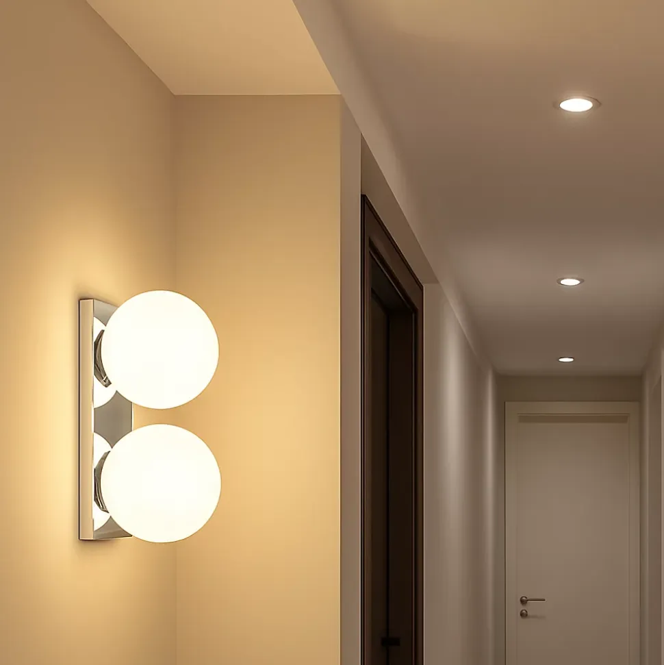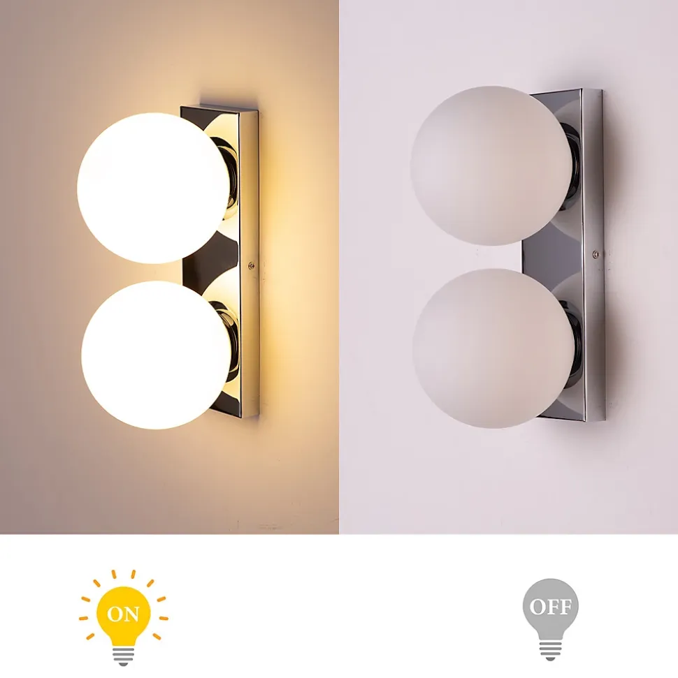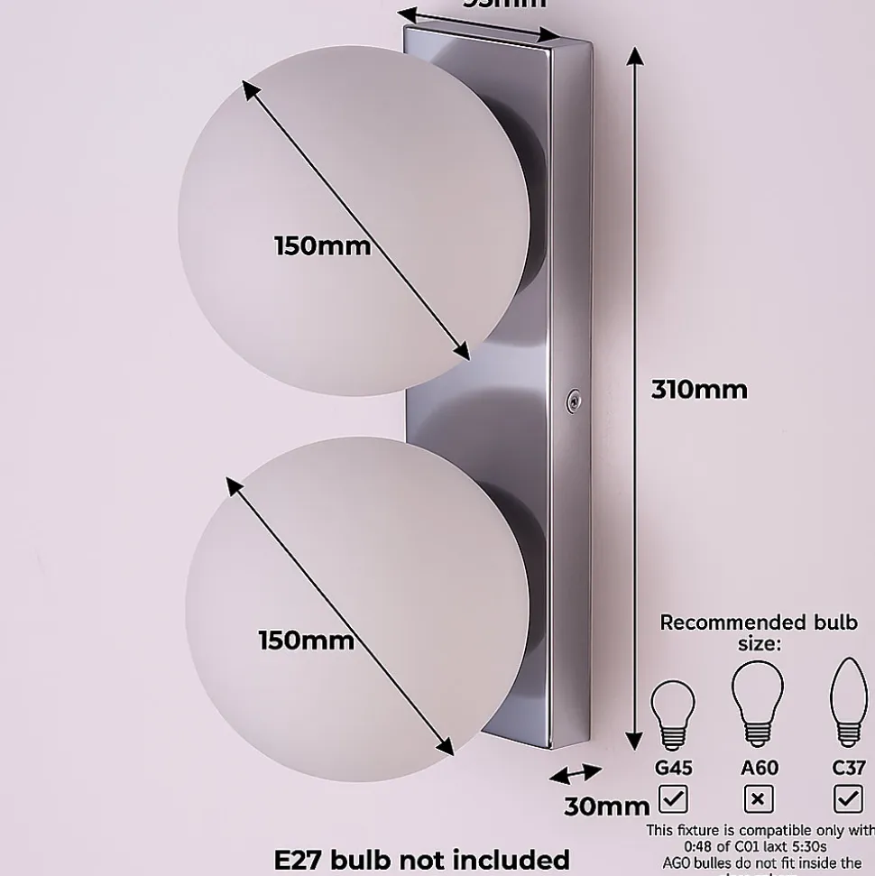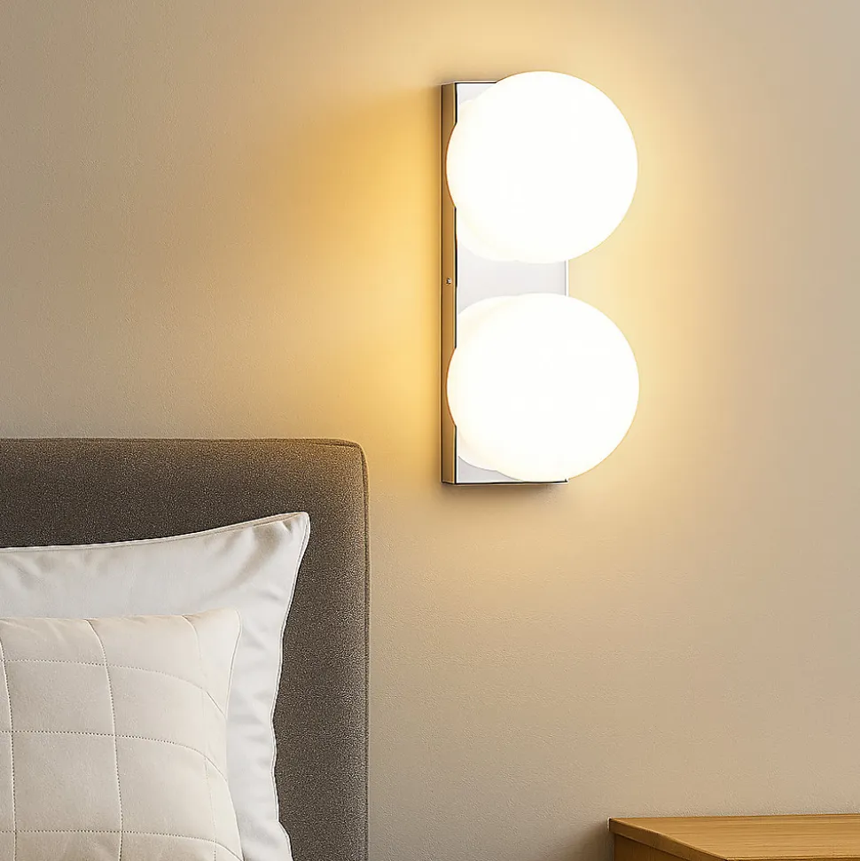 Applique Murale « Bolonia » – Double Sphère en Verre Opale et Base Rectangulaire Finition Chromée ou Dorée, E27L’applique murale « Bolonia » allie l’élégance du design contemporain à la douceur intemporelle du verre opale. Sa structure minimaliste se compose d’une base rectangulaire en métal —disponible en finition chromée ou dorée— qui soutient deux sphères en verre blanc mat, diffusant une lumière chaude et enveloppante.Parfaite pour apporter une touche sophistiquée aux salons, chambres, couloirs ou entrées, le modèle « Bolonia » est à la fois une solution d’éclairage fonctionnelle et un élément décoratif adapté aux styles modernes, classiques ou art déco.Caractéristiques principales :Design élégant avec double globe en verre opaleBase rectangulaire en métal, finitions : chromée brillante ou dorée chaudeDouilles E27 compatibles avec des ampoules LED G45 (non incluses)Lumière douce idéale pour les espaces de détente ou de passageInstallation facile avec matériaux de haute qualitéDisponible en deux finitions, l’applique « Bolonia » transforme n’importe quel mur en point focal plein de charme.