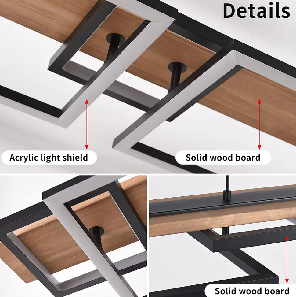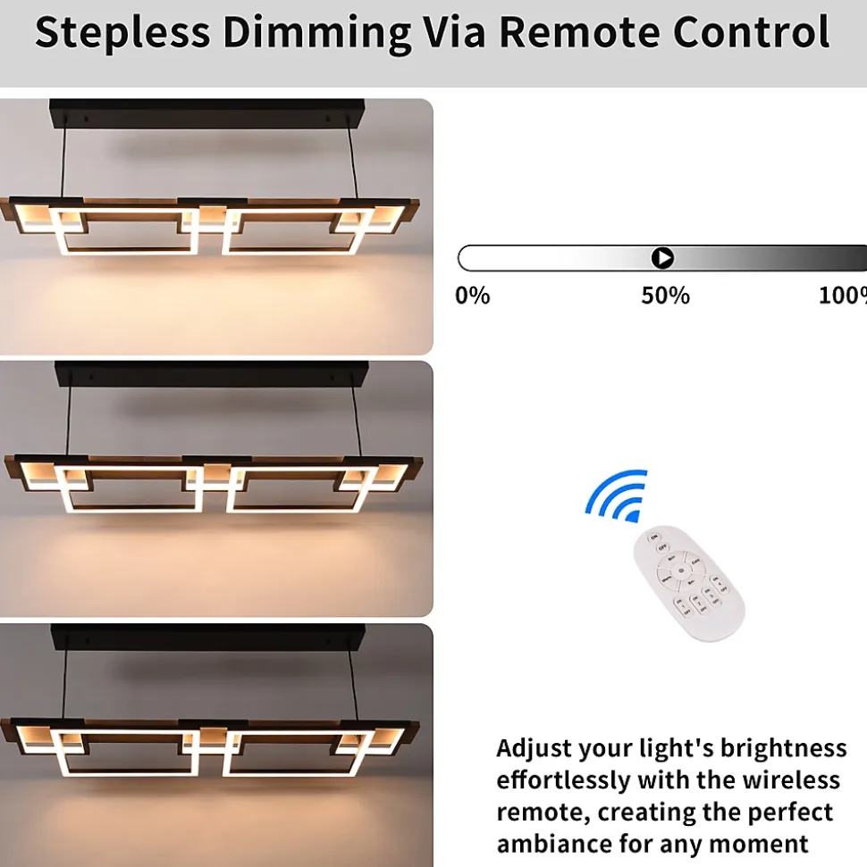La suspension Lucienne associe un design contemporain, une chaleur naturelle et une technologie avancée. Sa structure innovante à deux niveaux se compose de trois cadres carrés orientés vers l’intérieur en partie supérieure qui diffusent une lumière d’ambiance douce, et de deux cadres rectangulaires inférieurs qui projettent une lumière directe vers le bas, offrant un éclairage homogène et fonctionnel. Idéale au-dessus d’un îlot de cuisine, d’une table à manger ou d’un espace de travail.Le corps est fabriqué en et métal avec finition naturelle, tandis que les structures LED en aluminium et silicone assurent une grande durabilité et une excellente dissipation thermique.Grâce à la télécommande incluse, vous pouvez ajuster l’intensité lumineuse ainsi que la température de couleur (2700K – chaud, 4000K – neutre, 6500K – froid), pour créer l’ambiance parfaite à tout moment. Elle est également compatible avec les plafonds inclinés et dotée de câbles réglables en hauteur, ce qui la rend adaptée à tous les types d’intérieurs.Caractéristiques principales :Design moderne à deux niveaux avec 5 LED intégréesNiveau supérieur : 3 cadres carrés orientés vers l’intérieur (lumière d’ambiance)Niveau inférieur : 2 cadres rectangulaires (éclairage direct vers le bas)Matériaux : MDF et métal, structures LED en aluminium et siliconeIntensité lumineuse réglable (dimmable)Température de couleur réglable : 2700K / 4000K / 6500KPuissance totale : 60W – flux lumineux jusqu’à 4200 lmCRI > 80Compatible avec plafonds inclinésCâble réglable jusqu’à 200 cmLED intégrées – pas besoin d’ampoulesTélécommande incluse (piles non fournies)Certifications : ETL/ULDimensions :Pavillon : 96 × 12 × 4 cmStructure totale : 121 × 31 × 7 cmCadres carrés : 20 × 20 × 2 cmCadres rectangulaires : 41 × 31 × 2 cmPanneaux en bois : 121 × 11 × 2 cmLongueur de câble : jusqu’à 120 cmHauteur maximale : 131 cm