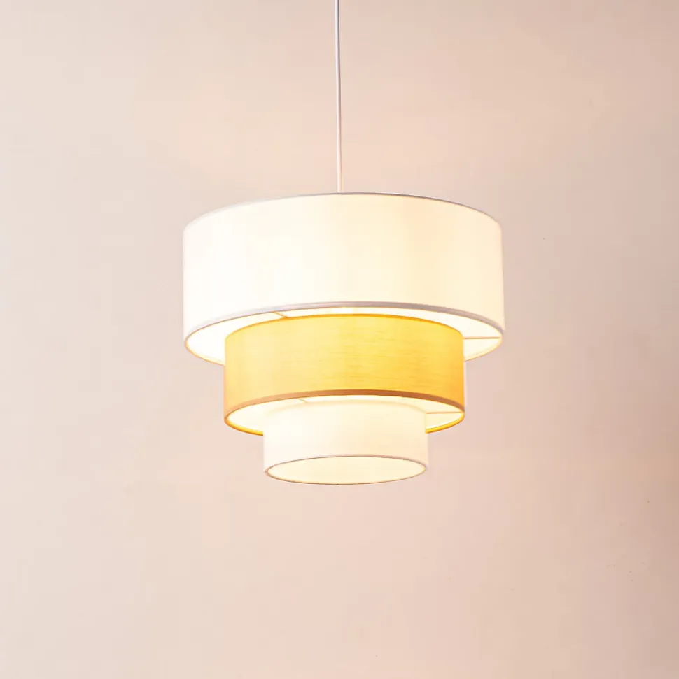 Suspension Textile “NIVELA” – Trois Niveaux, Ø38–40 cm x 30 cm, Douille E27La suspension “NIVELA” se distingue par son design textile à trois niveaux superposés, créant un effet visuel élégant, moderne et harmonieux. Parfaite pour les chambres, salons, couloirs, salles à manger et espaces de passage, elle apporte une atmosphère chaleureuse et décorative.Fabriquée en textile de haute qualité, elle diffuse la lumière de manière douce et uniforme. Compatible avec une ampoule E27 (LED ou standard), elle permet d’adapter la luminosité selon vos besoins.Disponible en plusieurs couleurs :Blanc, Jaune, Beige, Violet, Bleu, Vert, Marron.Dimensions : Ø38–40 cm de largeur et 30 cm de hauteur.Caractéristiques PrincipalesAbat-jour textile à trois niveaux, design moderne et décoratif.7 couleurs disponibles pour s’adapter à tout intérieur.Compatible ampoule E27 (non incluse).Lumière homogène et agréable.Idéale pour chambres, salons et couloirs.Dimensions : Ø38–40 cm × 30 cm.Légère, élégante et facile à installer.