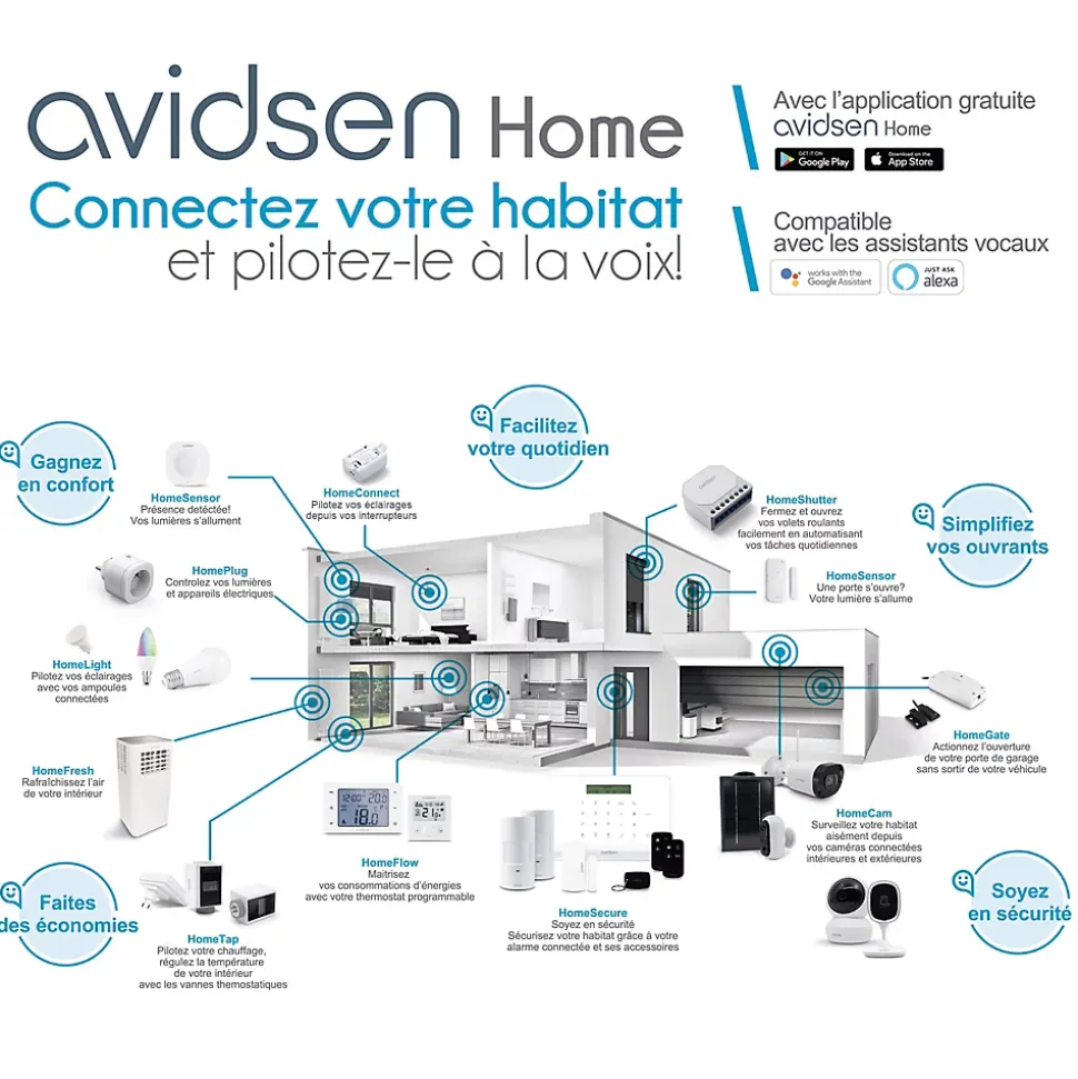 - Contrôle à distance via application ou assistants vocaux