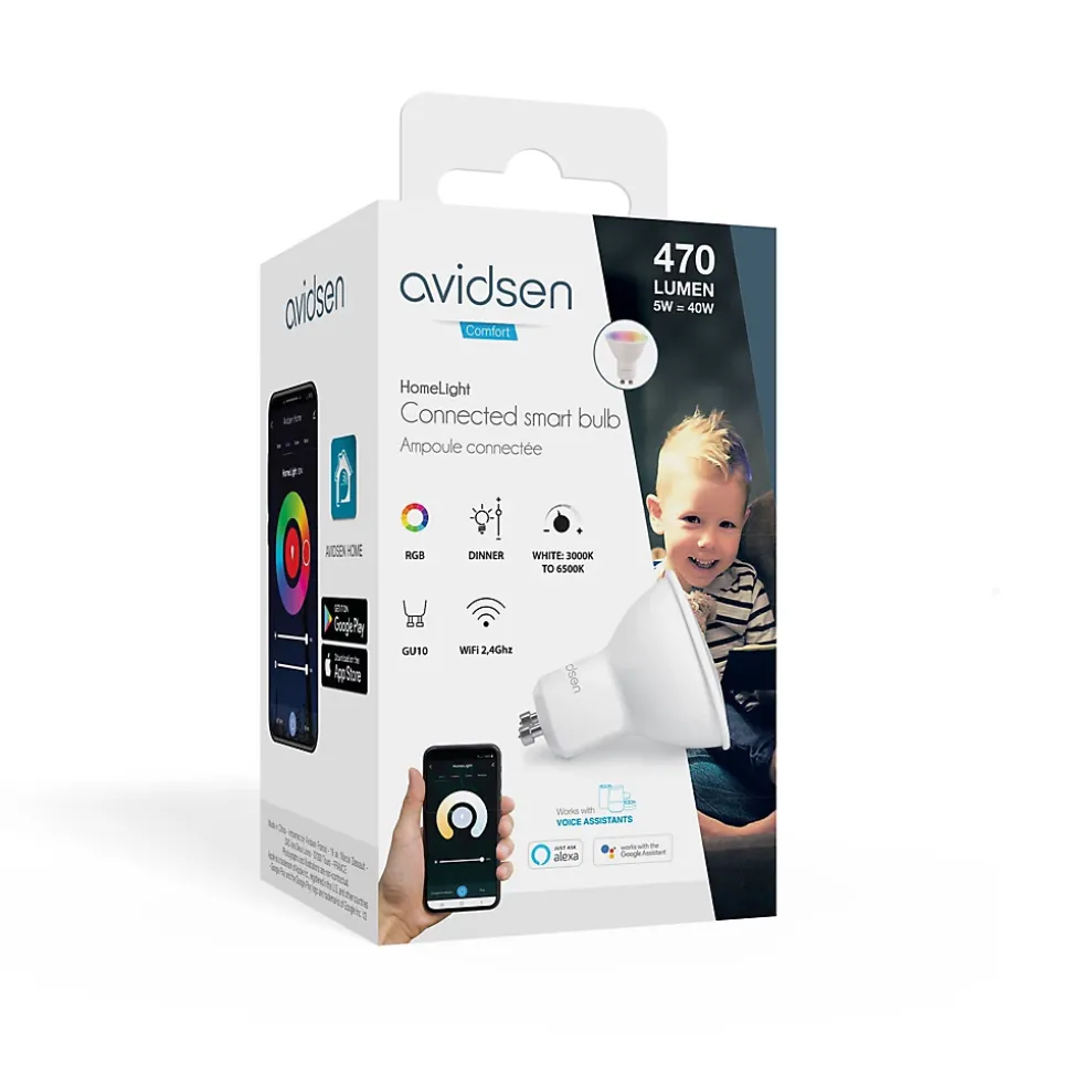 Commandez votre ampoule via commande vocale ou smartphoneCommandez votre ampoule où que vous soyez avec votre smartphone (allumer/éteindre, choisir l’éclairage) et l’application Avidsen Home. Vous pouvez aussi utiliser votre commande vocale pour prendre la main sur votre éclairage (Google ou Alexa). Variez l’intensité et la couleur de votre ampouleQue ce soit à la voix ou avec un clic, variez la couleur (blanc chaud, blanc froid ou couleur) de votre ampoule, ou son intensité (éclairage intense ou éclairage tamisé). Choisissez votre ambiance et l’éclairage selon vos besoins. L’ampoule intelligente rejoint votre habitat connectéLa maison connectée Avidsen est accessible à tous ; elle apporte plus de confort, plus de protection et des économies d’énergie. En prenant la main sur vos luminaires, où que vous soyez, en activant la simulation de présence, vos ampoules participent à votre routine intelligente. L’ampoule connectée d’Avidsen (et ce quel que soit le culot) est un accessoire indispensable pour votre maison connectée. Reliée à votre smartphone (avec l’application Avidsen Home) ou votre commande vocale (Google ou Alexa), l’ampoule propose différentes intensités, différents éclairages. NB : Petit bonus ludique, vous pouvez faire varier les couleurs en fonction des pulsations de la musique que vous écoutez sur votre smartphone. Les différentes options lorsque votre ampoule est alluméeÀ la voix (commande vocale), d’un simple clic (sur l’application), variez la couleur de votre ampoule selon vos besoins. Vous avez ainsi à votre disposition :