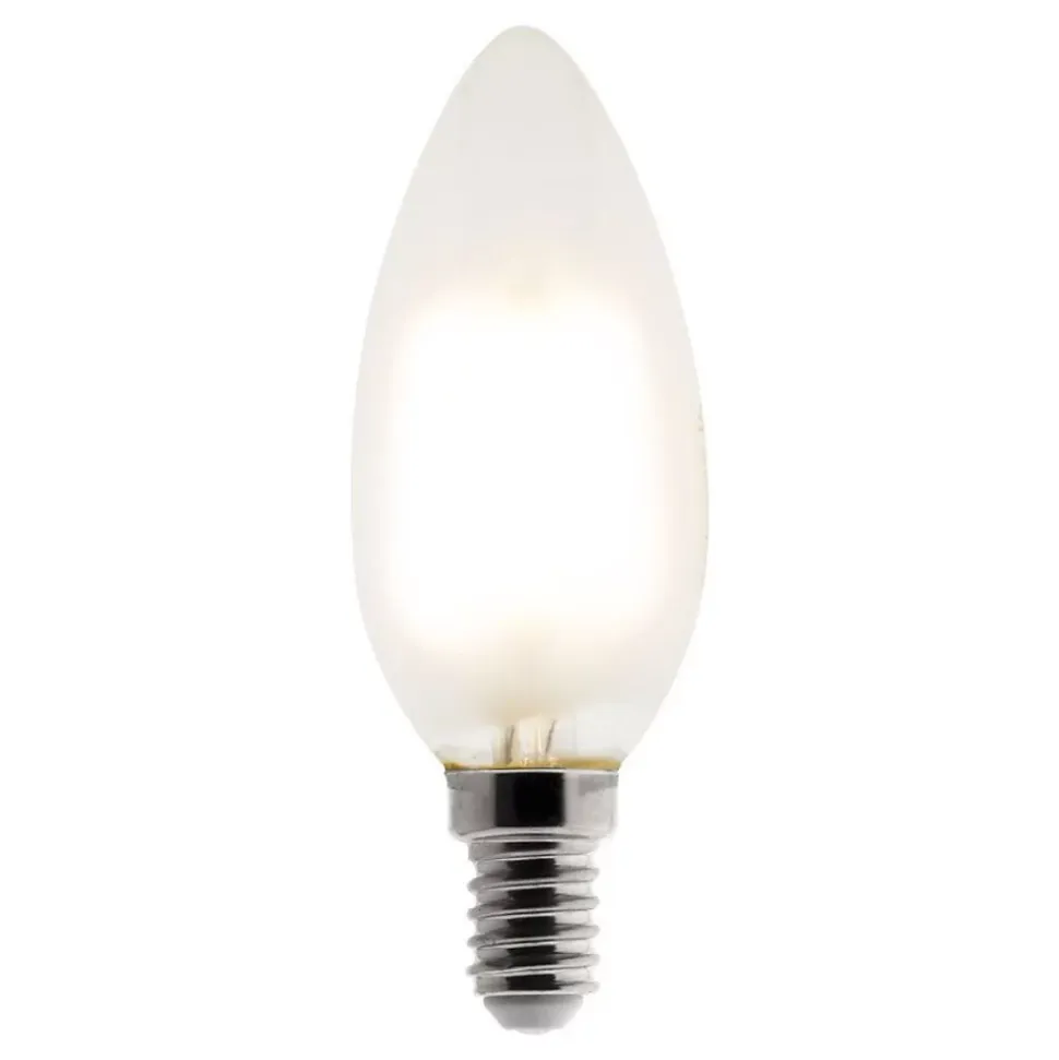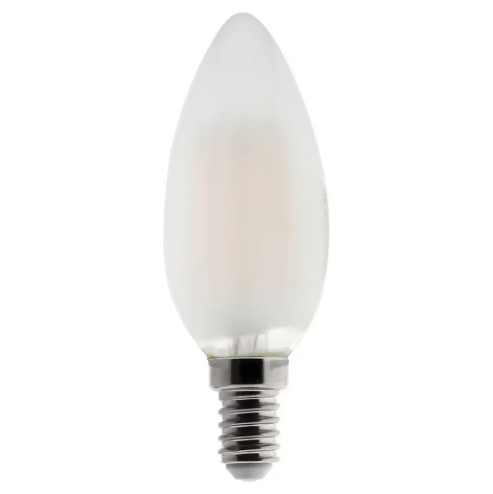 Ampoule Déco filament LED dépoli Flamme 4W E14 400lm 2700K (blanc chaud) Les ampoules LED filament mate permettent de créer une ambiance personnalisable et contemporaine tout en profitant de la technologie LED Consommation énergétique environ 80% plus faible que les ampoules traditionnelles