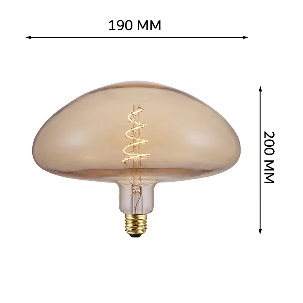 Ampoule LED style vintage à la forme unique de champignon Edison. Sa couleur jaune chaud (2200K) crée une atmosphère chaleureuse et nostalgique.Cette ampoule est dimmable, émettant une lumière vive et claire (400 lm), équivalente à une ampoule à incandescence de 40W, mais avec une consommation d’énergie bien moindre. Dotée d’une base E27, elle s’adapte à la plupart des prises standard et s’installe facilement, idéale pour l’éclairage décoratif.Accessoires de suspension disponibles en option : Suspension composable, Monture E27 (NON ampoule avec), Métal café câble textile café – Digilamp 12,50 €Suspension composable, Monture E27 (NON ampoule avec), Métal noir câble noir – Digilamp 12,50 €Suspension composable, Monture E27 (NON ampoule avec), Métal noir câble textile rouge – Digilamp 12,50 €Caractéristiques :Source lumineuse : LEDType de culot : E27Puissance : 4WFlux lumineux : 400LmTempérature de lumière : 2200K Blanc chaudDimension : ø190*200 mmDimmable : OuiTension nominale : AC 220-240VFréquence : 50/60HzAngle de diffusion : 360°Temps d’allumage : InstantanéDurée de vie : 25 000hMatière : verre ambréGarantie : 2 ans