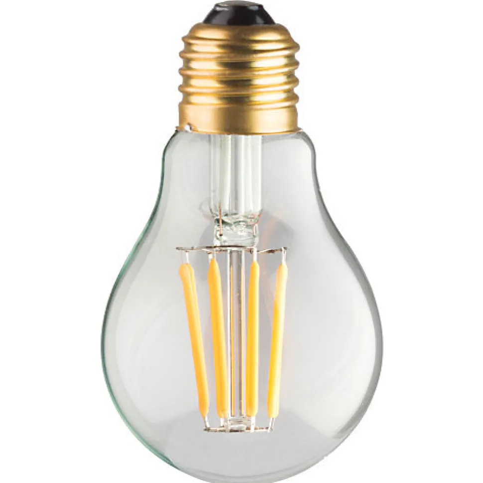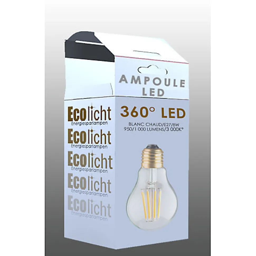 Ping vous propose :Cette ampoule LED A60 E27 de style classique. Pour donner un côté vintage ou industriel à votre déco intérieur, rien de mieux que cette ampoule en verre transparente en forme de bulbe, laissant apparaître les filaments lumineux de LEDs effilés droits. Cette ampoule se caractérise par son éclairage puissant et uniforme, sa longévité dans le temps et sa très faible consommation énergétique. Une lumière blanche chaude de 3000 K, lumière ambiante pour n’importe quel espace. Sa mise en place est aussi simple que les ampoules standards à incandescence car cette ampoule à LED est munie d’un culot E27 (vissable) et nul besoin d’abat-jour.Composée de LEDs protégées par le verre clair qui l’englobe, cette ampoule vous offrira une éclairage radial à 360°.Les plus du produit :- Economie énergétique- Nul besoin d’abat-jour- Eclairage radiant 360°- longévité dans le tempsCaractéristiques :Marque: EcolichtType : A60Libéllé 1 : A60 CLASSICCulot : E27LED : DroitsPuissance : 8WLumens : 950/1.000 Lm<s