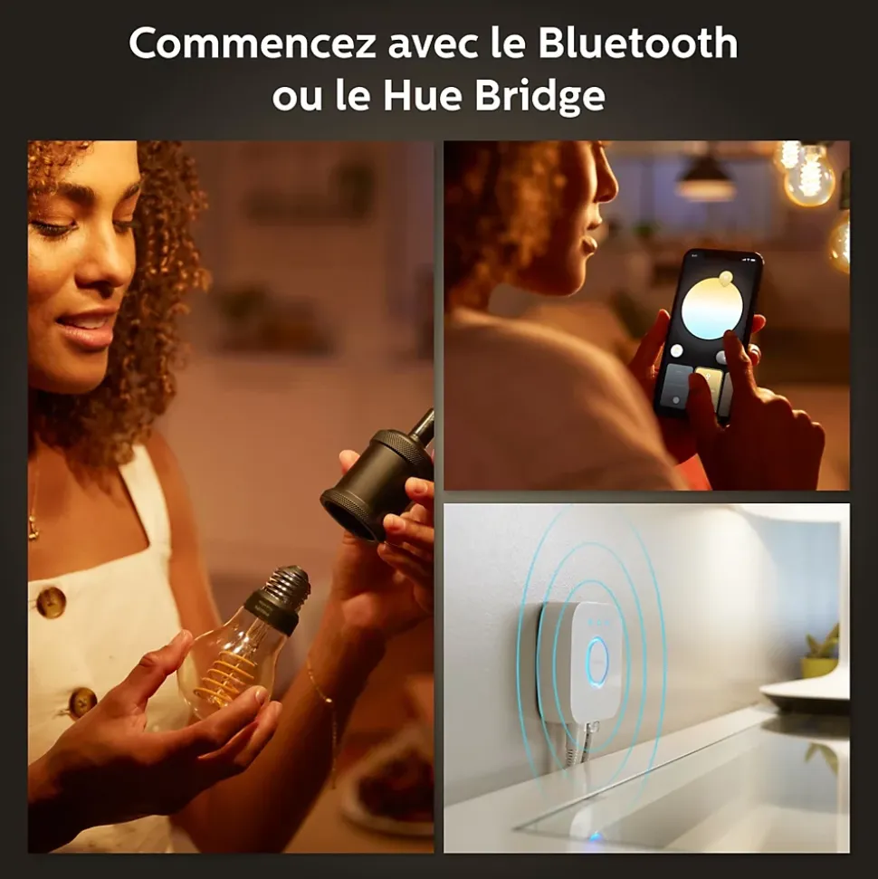 - Ajoutez le pont Hue (non fourni) et étendez votre éco-système en connectant jusqu’à 50 points d’éclairage tout en bénéficiant de fonctionnalités supplémentaires (gestion à distance, routines).