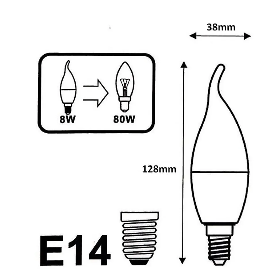 - Avec une consommation électrique 8W, notre Ampoule LED E14 Flamme 8W 220V Ø38mm possède un éclairage de 800 lumens.