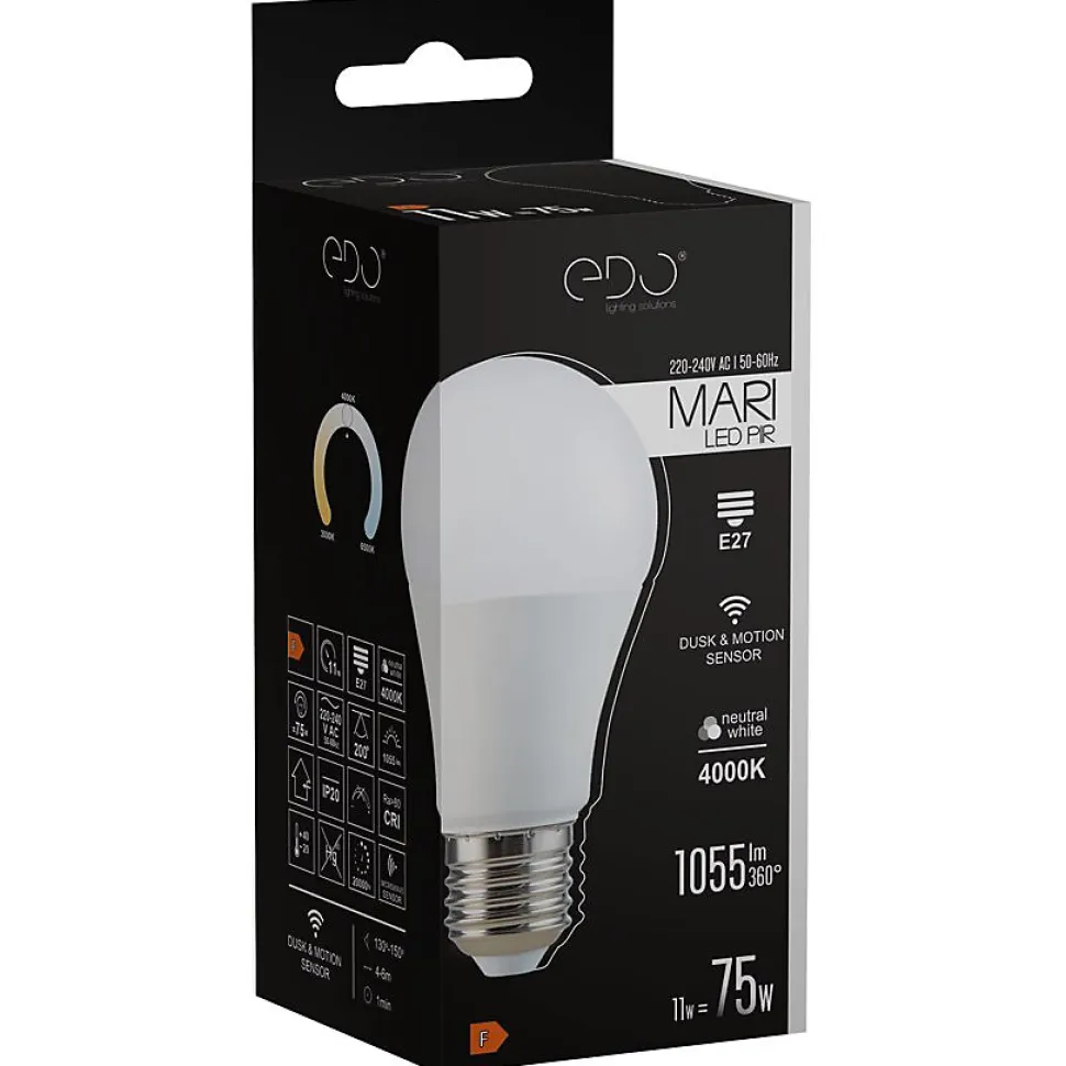 MARI LED SENSOR Ampoule NW 11W avec détecteur de mouvement et de crépuscule, blanc neutre E27, traditionnelle mat 4000K, 1055lm, 20000h 220-240V AC 50-60Hz EDO777592SPÉCIFICATIONS GÉNÉRALES ✔️diamètre : 60mm ✔️hauteur : 120mm ✔️Classe d’efficacité énergétique [A-G]: F ✔️Fonctionnement avec variateur : non ✔️Puissance en veille Psb/Pnet[W]:-. ✔️Modification de la couleur de la lumière : non ✔️Indice de rendu des couleurs CRI : 80 ✔️Indice de rendu des couleurs R9:13 ✔️Mesure du flux lumineux dans : sphère (360°) ✔️Efficacité lumineuse [lm/W] : 95,91lm/W ✔️Angle de distribution de la lumière [°]: 200°. ✔️Nombre de cycles d’allumage et d’extinction : 15000 ✔️Consommation d’énergie en mode marche [kWh/1000h] : 11kWh/1000h ✔️Déclaration d’équivalence de puissance [W]:75WDONNÉES DU CAPTEUR: ✔️Détecteur : mouvement et crépuscule ✔️Type de capteur : micro-ondes ✔️Angle de détection du capteur : 130°-150° ✔️Portée de détection du capteur [m] : 4-6m ✔️Temps de retard [min] : 1min