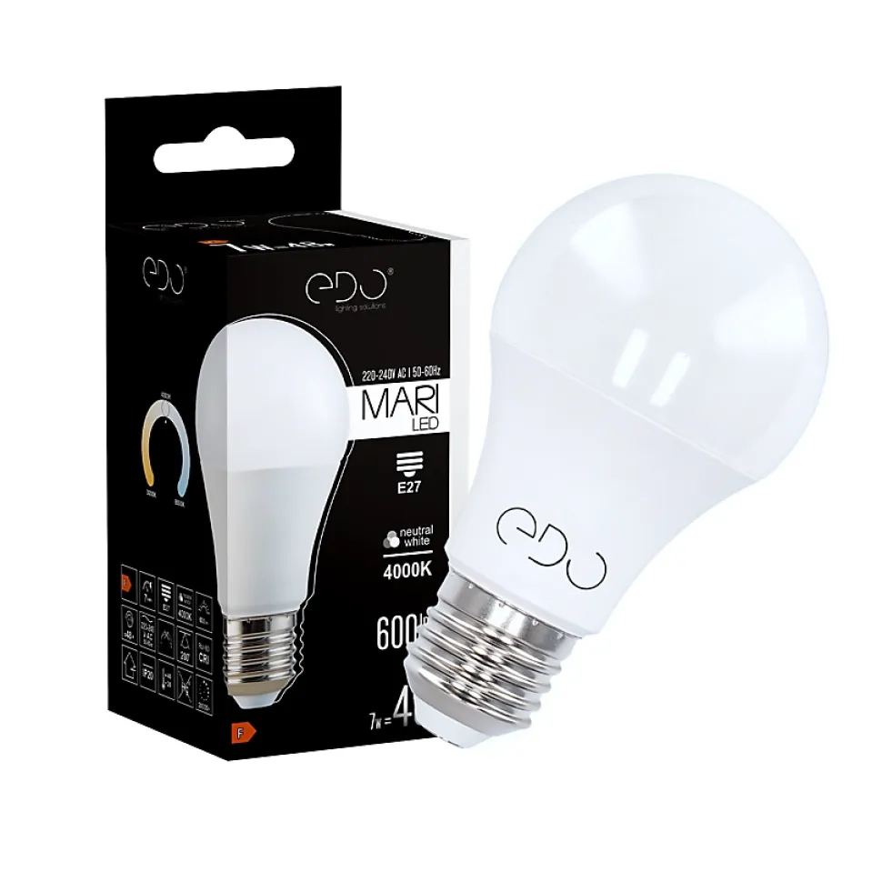 Ampoule LED MARI E27 7W 4000K neutre 600lm Edo SolutionsMARI LED E27 7W 4000K ampoule neutre 600lm. Technologie LED moderne et look classique. Offre des économies d’énergie et une longue durée de vie. Idéale pour toutes les pièces de la maison ou du bureau.✅ SPÉCIFICATIONS TECHNIQUES :✔️ Puissance : 7W✔️ Flux lumineux : 600lm✔️ Couleur de la lumière : 4000K✔️ Classe énergétique : F✔️ Angle lumineux : 200°✔️ Durée de vie : 20000h✔️ Alimentation : 220V-240V✔️ Forme de l’ampoule : traditionnelle✔️ Couleur de la bulle : mat