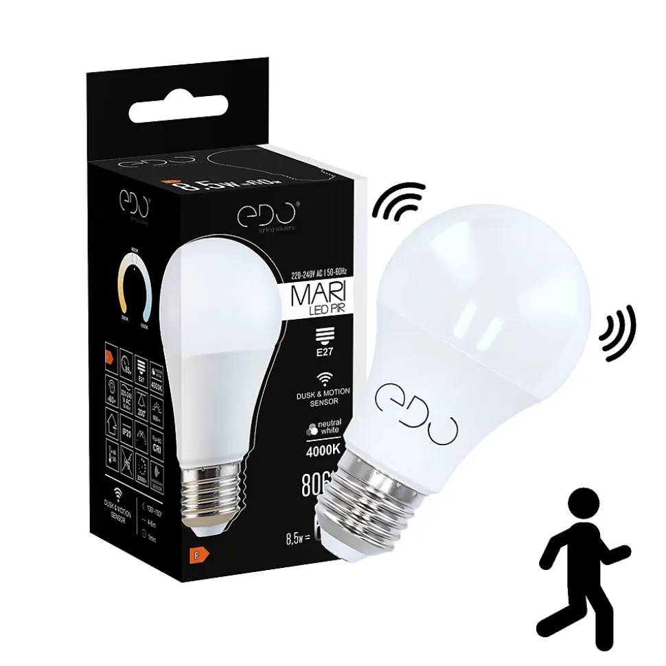 EDO, MARI LED SENSOR 8,5W NW ampoule avec détecteur de mouvement et de crépuscule, E27, 4000K, 806lm, 220-240V, 20000hDONNÉES GÉNÉRALES:✔️Couleur du couvercle: mat✔️Forme de l’ampoule: traditionnelle✔️Classe d’efficacité énergétique[A-G]: F✔️Fonctionnement avec variateur: non✔️diamètre:60mm✔️hauteur:110mm✔️Puissance en mode veille Psb/Pnet[W] : -.✔️Fréquence nominale[Hz]: 50-60 Hz✔️Couleur de lumière: Blanc neutre✔️Modification de la couleur de la lumière: non✔️Indice de rendu des couleurs IRC: 80✔️Indice de rendu des couleurs R9:12✔️Flux lumineux utilisable[lm]: 806lm✔️Mesure du flux lumineux en: Sphère(360°)✔️Efficacité lumineuse[lm/W]: 94,82lm/W✔️Angle de distribution de la lumière[°] : 200✔️Nombre de cycles marche/arrêt: 15000✔️Consommation d’énergie en mode marche[kWh/1000h] : 9kWh/1000h✔️Déclaration d’équivalence de puissance[W]:60WDONNÉES DU CAPTEUR:✔️Capteur: mouvement et crépuscule✔️Type de capteur: micro-ondes✔️Angle de détection: 130°-150✔️Zone de détection du capteur[m]: 4-6m✔️Temps de retard[min]: 1min