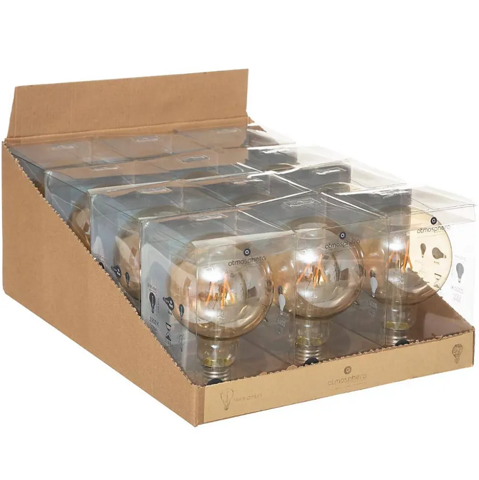 Pour créer un intérieur élégant et contemporain, les ampoules sont désormais des pièces décoratives à part entière. Essayez l’ampoule LED « Globe » à filament droit Atmosphera !Une ampoule qui embellit votre pièceL’ampoule « Globe » est composée d’un filament droit qui lui confère un design sobre facile à intégrer. Elle permet de délimiter un espace dans votre salon ou d’éclairer des objets déco sur une étagère. Le résultat est surprenant !Cette ampoule « Globe » s’adapte aux suspensions en métal ou en bois Atmosphera à 4 ampoules.Le petit plus décoPlacé sur une suspension à plusieurs ampoules, ce modèle « Globe » diffusera une lumière agréable au-dessus d’une table à manger.Fiche d’information produit : voir notice