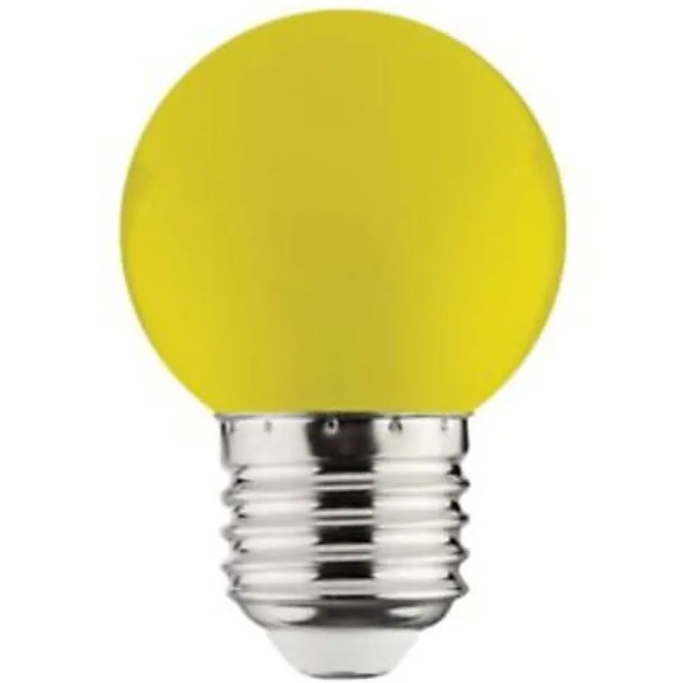 Cette ampoule LED globe jaune 1W (Eq. 8W) E27 est également disponible en rouge, vert et bleu. (Diam 45mm- Long 69.5mm). Nos ampoules LED globe de couleur peuvent être utilisées avec tous types de luminaires en décoration. Cependant elles seront idéalement mises en valeur montées sur une guirlande en mixant les couleurs des ampoules. L’ampoule LED globe jaune 1W (Eq. 8W) E27 existe en rouge, vert, jaune et bleu pour illuminer vos soirées, animations ou spectacles. Grâce à son rendement énergétique élevé, elle possède une classe énergétique A+. Cette ampoule est conforme à la norme CE, à la directive RoHS et DEEE.
