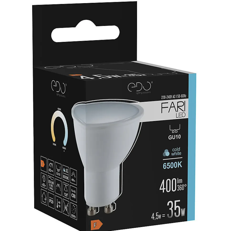 Ampoule LED FARI GU10 4.5W 6500K froid 400lm 120° EDO777439 Edo SolutionsAmpoule FARI LED GU10 4,5W 6500K froid 400lm. Technologie LED moderne et look classique. Offre des économies d’énergie et une longue durée de vie. Idéale pour toutes les pièces de la maison ou du bureau.Dimensions [mm] : ✔️diamètre : 50 mm✔️hauteur : 56 mmDONNÉES GÉNÉRALES :✔️Type de source : LED ✔️Culot : GU10✔️Couleur de la lentille : mat✔️Forme de l’ampoule : réflecteur✔️Classe d’efficacité énergétique [A-G] : F✔️Compatibilité avec un variateur : non✔️Puissance en mode marche Pon [W] : 4,5 W✔️Puissance en mode veille Psb/Pnet [W] : -✔️Tension nominale [V] : 220-240 V CA✔️Fréquence nominale [Hz] : 50-60 Hz✔️Couleur de la lumière : blanc froid✔️Température de couleur [K] : 6500K✔️Changement de couleur de la lumière : non✔️Indice de rendu des couleurs CRI : 80✔️Indice de rendu des couleurs R9 : 10✔️Flux lumineux utile [lm] : 400 lm✔️Mesure du flux lumineux dans : sphère (360°)✔️Efficacité lumineuse [lm/W] : 88,9 lm/W✔️Angle de distribution lumineuse [°] : 120°✔️Durée de vie nominale [h] : 20000h✔️Nombre de cycles marche/arrêt : 15000✔️Consommation d’énergie en mode marche [kWh/1000h] : 5kWh/1000h✔️Déclaration d’équivalence de puissance [W] : 35W