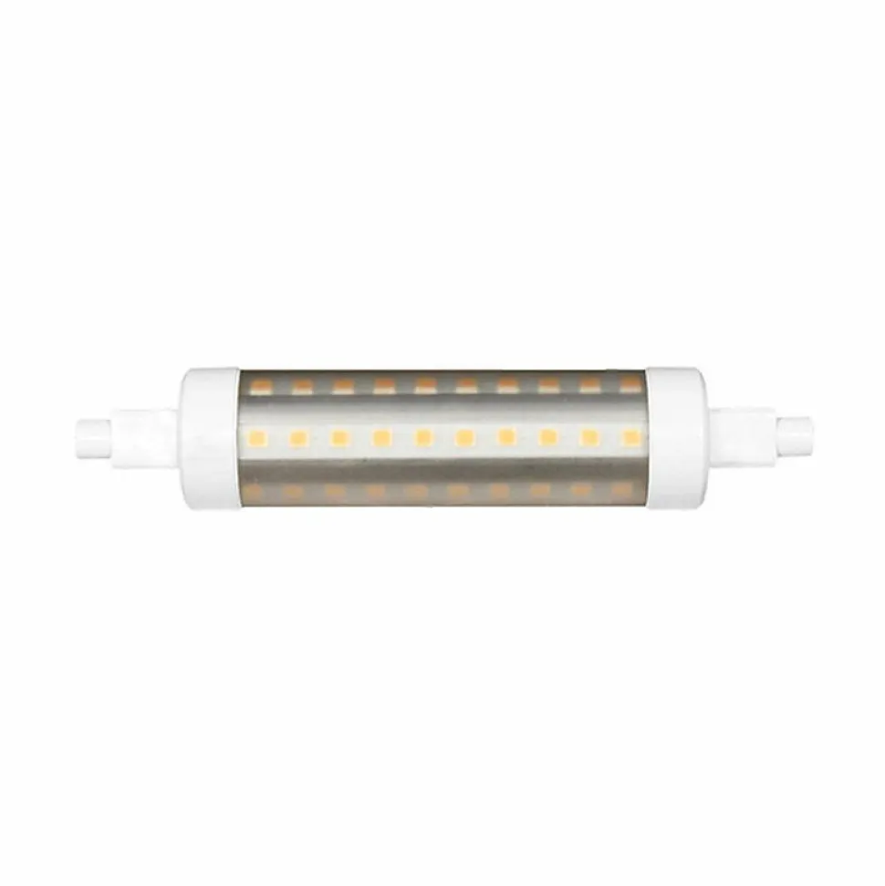 Ampoule LED 11watt avec culot R7s et longueur 118mm et dimmable, il est possible de varier l’intensité de la lumière. Remplace les anciennes ampoules halogènes linéaires de 100 W.Ampoule halogène LED dimmable de 11watt et 1280 lumen avec un diamètre de seulement ø23mm !Cette ampoule LED avec culot R7S et 118 mm a un angle d’ouverture de la lumière grâce auquel il est possible d’avoir une lumière à 360°, donc l’ampoule entière, idéale pour chaque application et une luminosité accrue.Où puis-je placer mon ampoule LED R7S 118 mm 11 watts ? Ampoule LED avec douille R7S de 118 mm et puissance de 11 watts, idéale pour une installation dans des appliques murales, des plafonniers, des lustres, des lampadaires, des phares halogènes ou partout où il y a des ampoules halogènes de 118 mm qui doivent être ajustées, c’est possible, en effet, avec un variateur, ajustez l’intensité lumineuse de cette ampoule LED. Les ampoules halogènes à intensité variable se retrouvent très souvent dans les appliques murales ou les lampadaires. Elles remplacent les anciennes ampoules halogènes de 100 Watts, avec un flux lumineux de 1280 lumens. Chaque ampoule LED ne peut être installée à l’extérieur que si elle est protégée de l’eau et insérée à l’intérieur de structures étanches telles que des globes ou des lanternes.Ampoule LED linéaire avec douille R7s avec connexion directe au 230V.Ampoule LED linéaire R7s avec classe de protection IP40.Ampoule LED dimmable, avec un variateur il est possible de varier l’intensité de la lumière. Si elle ne fonctionne pas avec le variateur utilisé avec une ampoule halogène, elle doit être remplacée par un variateur spécial pour LED
