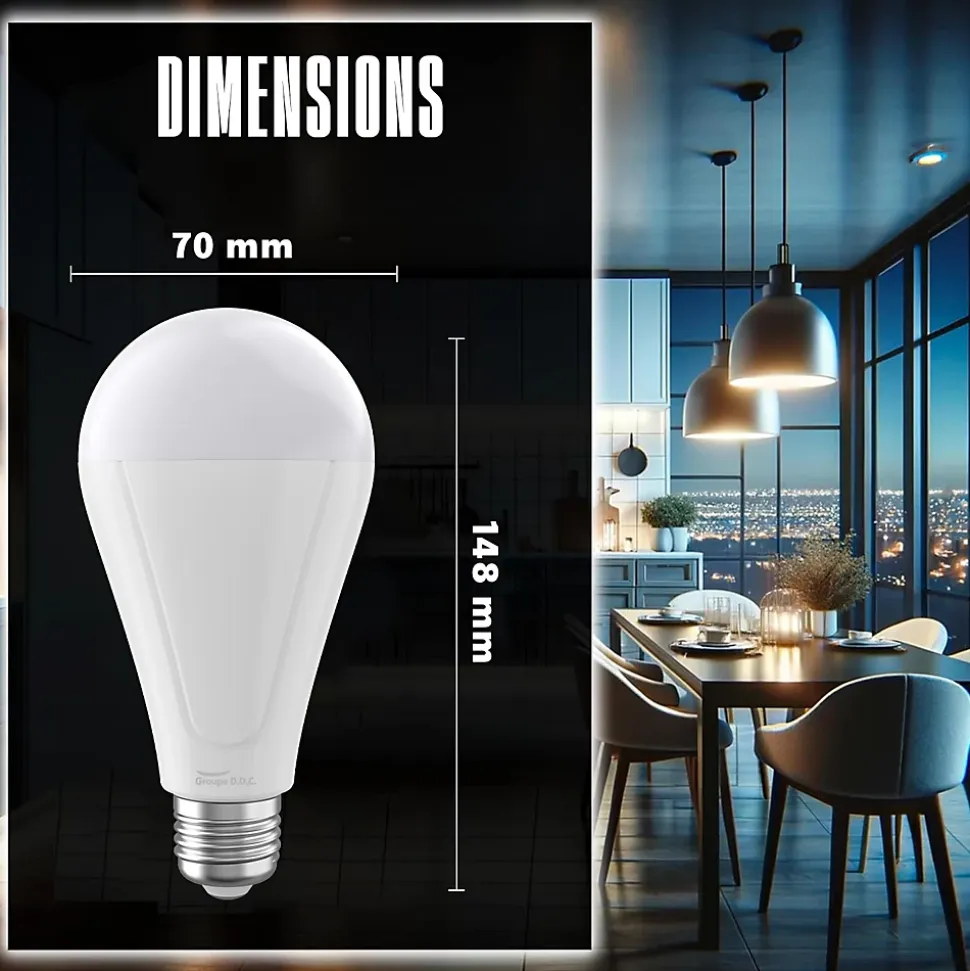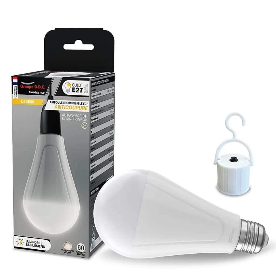 Cette ampoule LED rechargeable est une innovation idéale pour assurer un éclairage continu en toutes circonstances, notamment en cas de coupure de courant. Grâce à sa batterie intégrée, elle continue de fonctionner pendant jusqu’à 9 heures, offrant une source de lumière fiable et pratique.Disponible en 650 lumens et 1050 lumens, cette ampoule offre une intensité lumineuse adaptée à tous les besoins, avec une température de couleur de 4000K, idéale pour un éclairage naturel et équilibré. Son flux lumineux efficace garantit une belle homogénéité de la lumière, comparable aux ampoules incandescentes ou halogènes, tout en étant bien plus économe en énergie.Son culot E27 standard permet une installation rapide et universelle, la rendant compatible avec une large gamme de luminaire, lampe de chevet, plafonnier ou applique murale. Son crochet avec interrupteur ON-OFF inclus permet également une utilisation nomade, idéale pour le camping, les sous-sols ou les garages en cas de panne.
