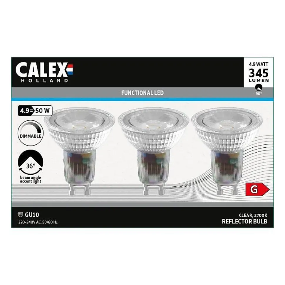 Ampoule réflecteur LED GU10 Calex 4,9 W (équiv. 50 W) — 345 lm, lumière blanc chaud 2700 K, dimmable, faisceau 36°, finition chrome avec réflecteur prismatique, durée de vie estimée 15 000 h, pour 220–240 V.