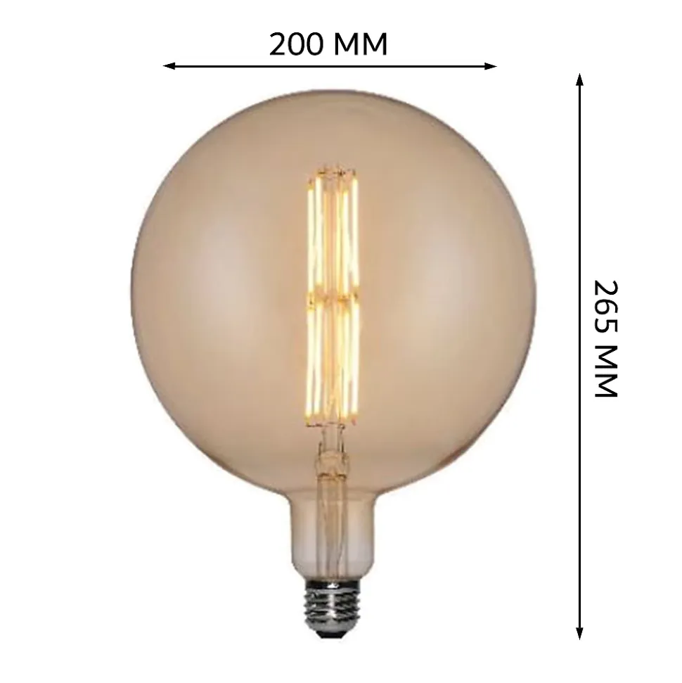Une touche chic pour les pièces : l’ampoule LED globe géante E27 7W 2200K est parfaite pour éclairer et décorer les salons, salles à manger, chambres, bureaux, locaux et magasinsVerre ambré : cette ampoule à filament tendance est fabriquée en verre avec une belle finition ambré transparente. Convient pour une utilisation en intérieur. Dimensions : Ø200 x 265 mm (diamètre x hauteur)Lumière blanche chaude (2 200 K) : cette ampoule LED à filament produit une excellente lumière blanche chaude grâce à sa température de couleur de 2 200 K. Créez des environnements chaleureux et intimes.Ampoule dimmable : Luminaire à culot E27, flux lumineux de 550 lumens, angle d’ouverture de 320°, 220-240 V AC (50 Hz) et 7 W de puissance maximale. Type d’ampoule globe géante G200Durée de vie de 25 000 h : dispose d’une durée de vie allant jusqu’à 25 000 h. Efficacité lumineuse de 70 lm/W. Protection IP20 Cette ampoule LED à filament Vintage est sans mercure.Accessoires de suspension disponibles en option : Suspension composable, Monture E27 (NON ampoule avec), Métal café câble textile café – Digilamp 12,50 €Suspension composable, Monture E27 (NON ampoule avec), Métal noir câble noir – Digilamp 12,50 €Suspension composable, Monture E27 (NON ampoule avec), Métal noir câble textile rouge – Digilamp 12,50 €Caractéristiques :Source lumineuse : LEDType de culot : E27Puissance : 7WFlux lumineux : 550LmTempérature de lumière : 2200K Blanc chaudDimension : ø200*265 mmDimmable : OuiTension nominale : AC 220-240VFréquence : 50/60HzAngle de diffusion : 360°Temps d’allumage : InstantanéDurée de vie : 25 000hMatière : verre ambréGarantie : 2 ans