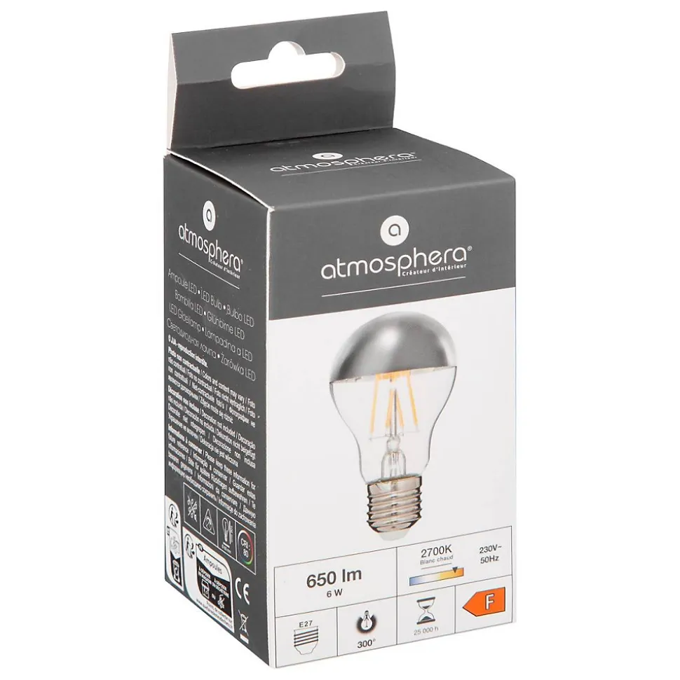 Pour un éclairage glamour, craquez pour le charme unique de cette ampoule LED Atmosphera.Un accessoire chic mais accessibleMalgré une apparence classique, cette ampoule LED possède une calotte argentée qui lui donne toute sa particularité. Elle mettra immédiatement un luminaire en valeur. Ce design atypique s’adaptera joliment à un intérieur contemporain.Placez cette ampoule LED dans une suspension en métal Atmosphera pour créer un contraste remarquable.Le petit plus décoPour une pièce de vie harmonieuse, ajoutez quelques objets déco dans le même ton comme un vase, une statuette ou un chandelier.