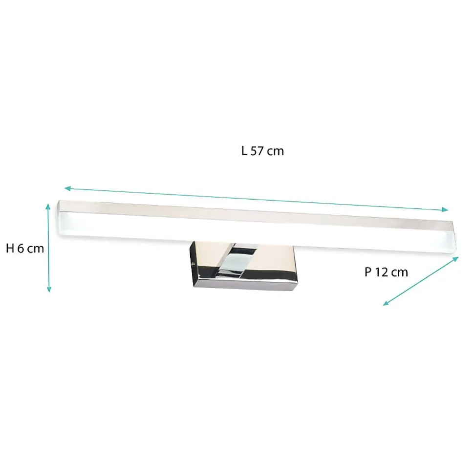 Dimensions du produit (L x l x h) : 61 cm x 15 cm x 9 cm ; Poids : 1,2 Kilogrammes ; Watt : 12W ; Batterie(s) / Pile(s) requise(s) : non ; Type de piles : non ; Matière : Aluminium ; Couleur : Chrome ; Couleur de la lumière : Chrome ; Kelvins : 4000K ; Lumens : 960 ; Etanche : oui ; Indice de protection IP : IP44