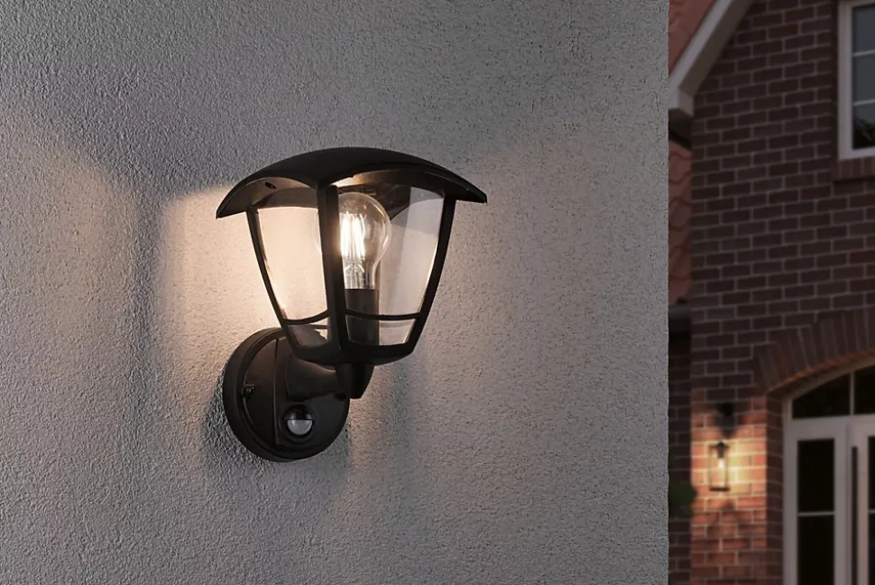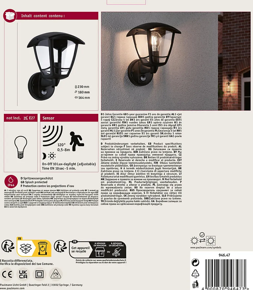 Détecteur de mouvement|Pour raccordement direct au secteur 230V|Protection IP : IP44 – Protection contre les projections d’eau|Ampoule E27 jusqu’à 12 watts|Ne pas oublier : Commandez l’ampoule adaptée en même temps !|Des effets lumineux décoratifs mettent le mur en scène
