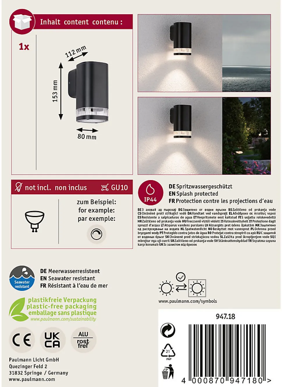 Luminaire résistants à l’eau de mer pour une utilisation près du littoral|Protection IP : IP44 – Protection contre les projections d’eau|Ampoules au choix|Pour des touches lumineuses attrayantes sur les murs extérieurs|Intensité variable