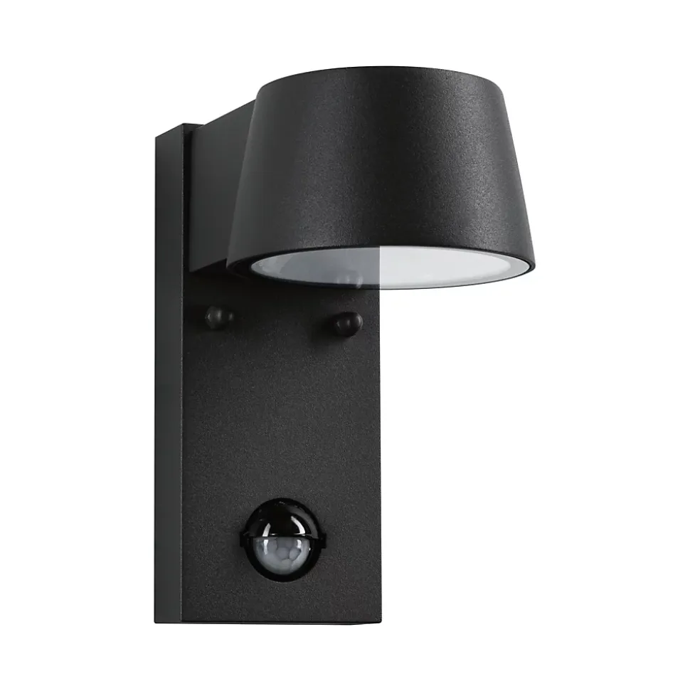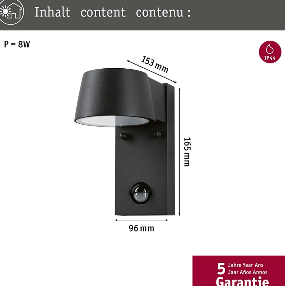 IP44 Protection contre les projections d’eau|Pour des touches lumineuses attrayantes sur les murs extérieurs|Commutation automatique par détecteur de mouvement intégré|Pour raccordement direct au secteur 230V|Température de couleur: 3000K – Blanc chaud
