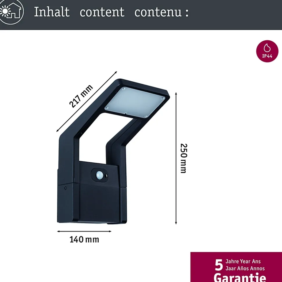 QuickPlug : connecteur de montage innovant pour accélérer l’installation grâce à un plus grand encombrement et un système de raccordement simple|Luminaire résistants à l’eau de mer pour une utilisation près du littoral|Protection IP : IP44 – Protection contre les projections d’eau|Pour des touches lumineuses attrayantes sur les murs extérieurs|Convient pour une utilisation à l’extérieur|Température de couleur: 3000K – Blanc chaud|L’interrupteur crépusculaire ne se met en marche qu’à partir d’un certain degré d’obscurité|Commutation automatique par détecteur de mouvement intégré|Pour raccordement direct au secteur 230V