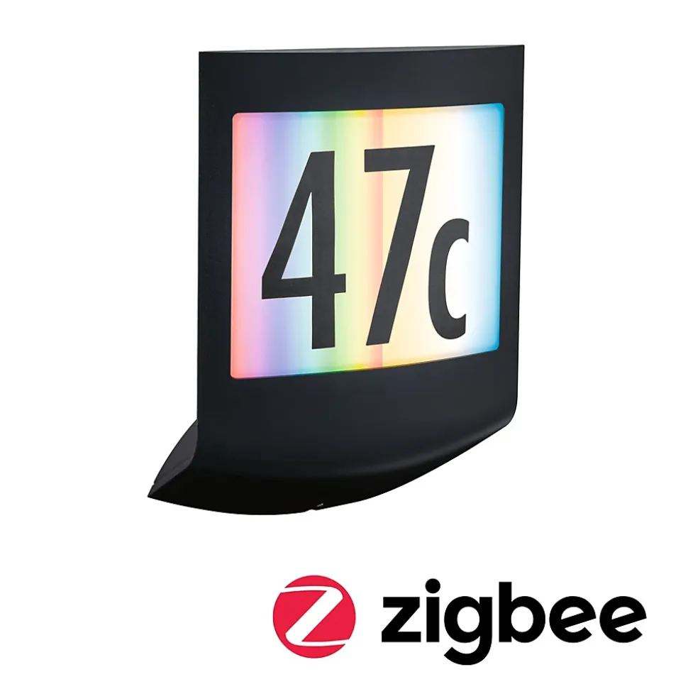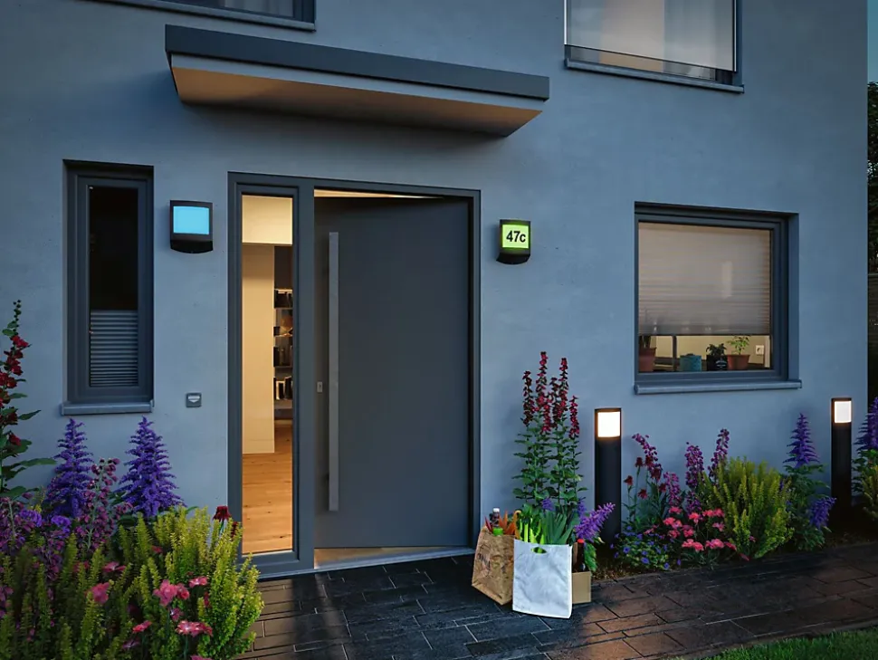 Éclairage extérieur avec couleurs RGBW et Tunable White|Avec un jeu de chiffres et de lettres à utiliser comme numéro de maison lumineux|IP44 – Protection contre les projections d’eau, y compris en extérieur|Grâce à la commande de lumière blanche intelligente Tunable White, vous pouvez régler en continu et personnaliser la température de couleur|La fonction RGBW permet de choisir librement la température de couleur|Convient pour une utilisation à l’extérieur|Pour des touches lumineuses attrayantes sur les murs extérieurs|L’interrupteur crépusculaire ne se met en marche qu’à partir d’un certain degré d’obscurité