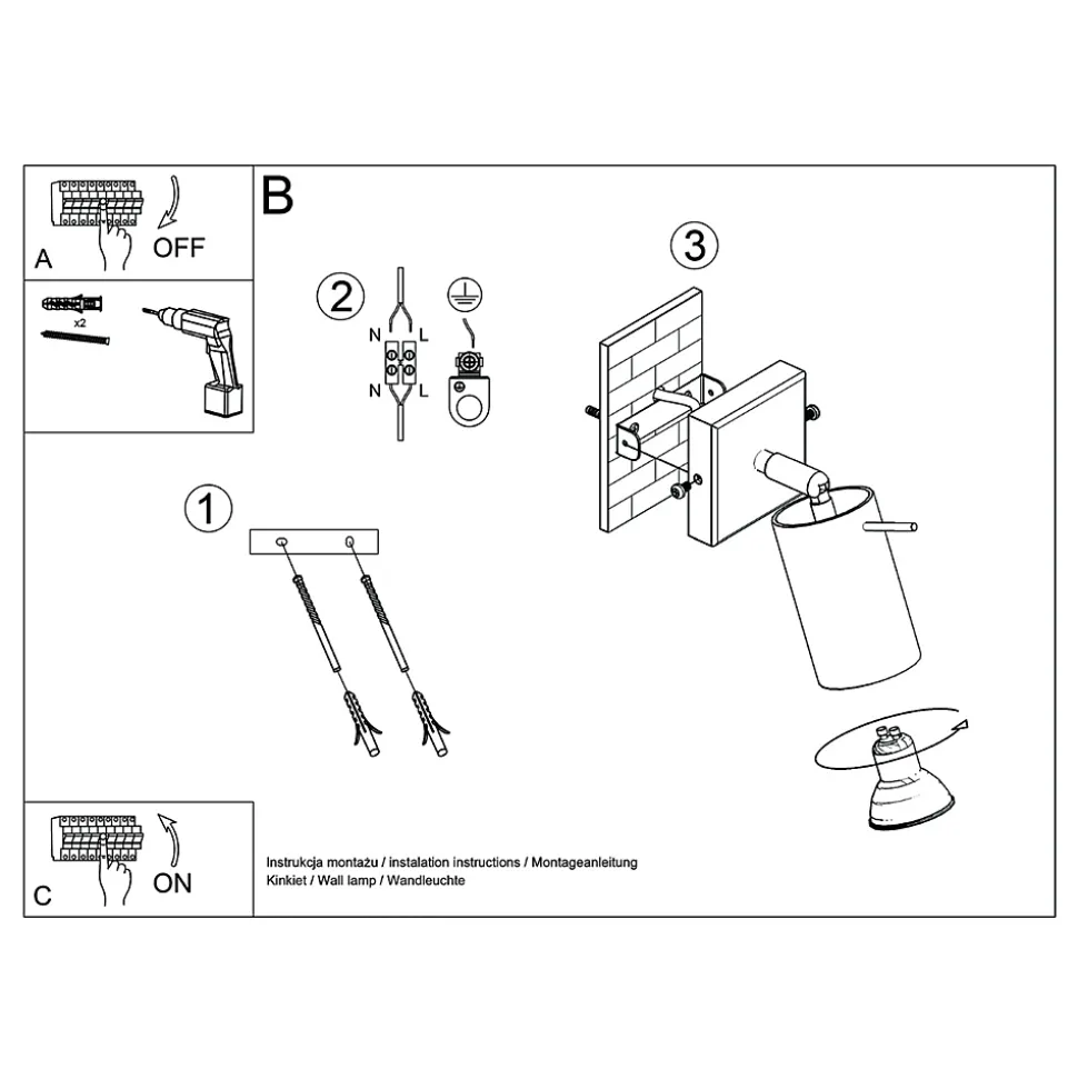 - Source lumineuse : GU10, 1x LED max 10W, ~230V, 50Hz, IP20, classe de protection I