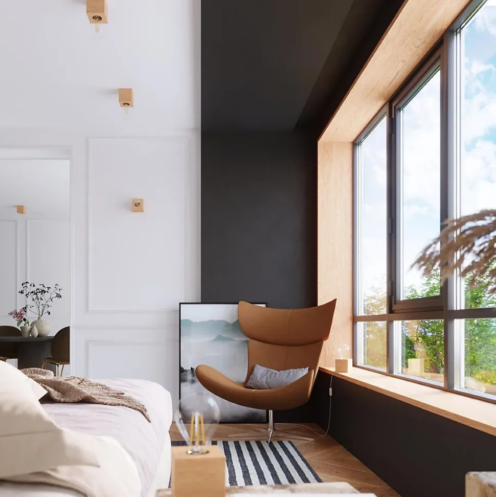 - Le bois naturel apporte chaleur et calme dans la pièce.