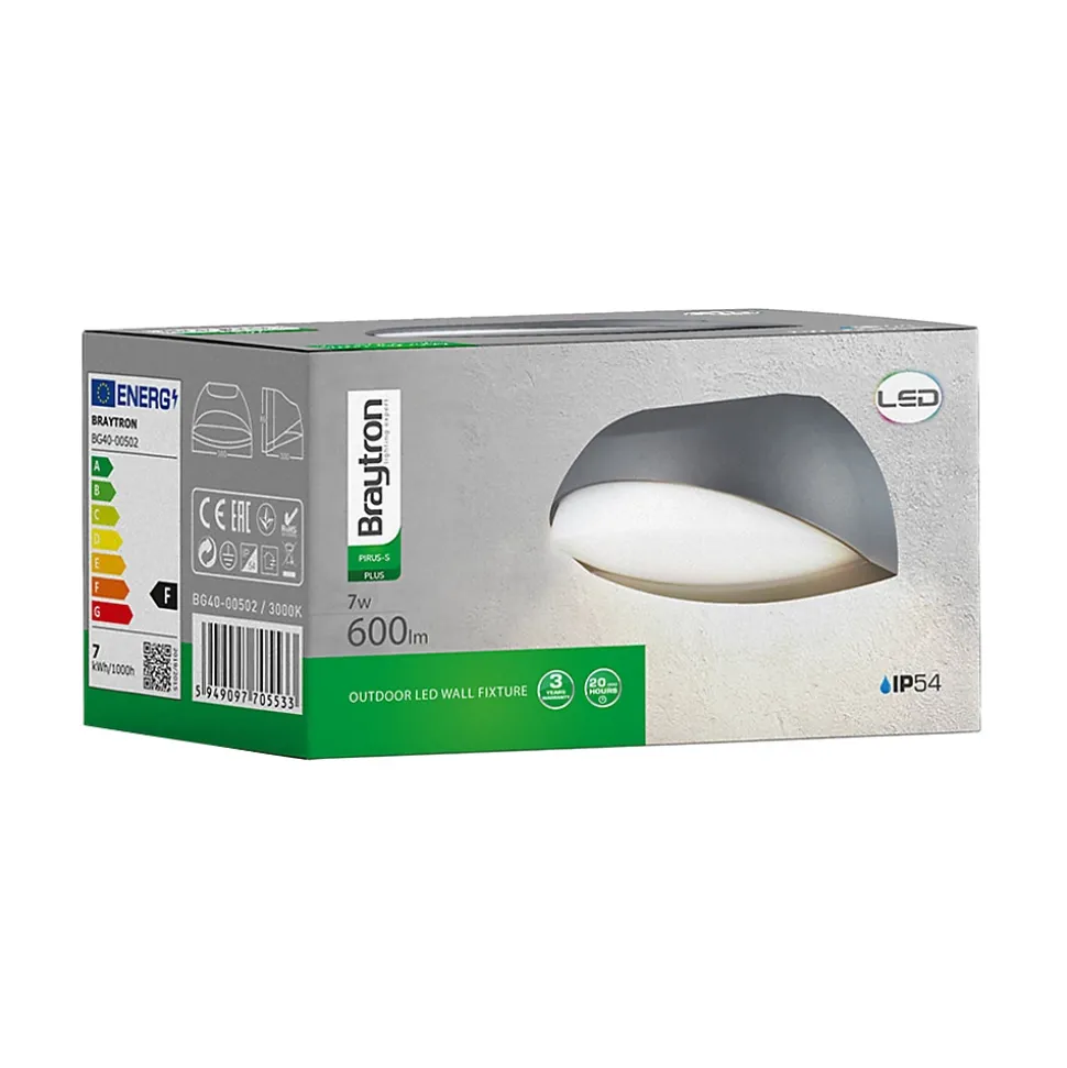 L’applique extérieur PIRUS 7W LED 3000K IP54 est dotée d’un indice de protection IP54 et convient donc à une installation extérieur en façade. La qualité des finitions est irréprochable pour cette applique moderne qui met en valeur les façades tout en sécurisant l’accès au domicile. Cette applique extérieur PIRUS 7W LED 3000K IP54 est protégée contre la corrosion par une peinture poudre de polyester. L’installation est simple et rapide car la pose est en saillie. La finition gris mat apporte une touche sobre et raffinée. La structure est en aluminium et le diffuseur en PC robuste et durable est anti-reflet. L’angle de diffusion du faisceau lumineux est de 120°. La température de couleur est de 3000Kelvin blanc chaud et la puissance lumineuse de 600Lumens. L’indice de protection IP54 assure que le produit est : Protégé contre les poussières et autres résidus microscopiques Protégé contre les jets d’eau de toutes directions à la lance (buse de 6,3 mm, distance 2,5 à 3 m, débit 12,5 l/min ±5 %). Les produits dotés d’un indice de protection IP54 sont destinés à une installation extérieur. Hauteur : 86mm Longueur : 160mm Profondeur : 100mm Culot : LED intégrée Indice de protection : IP54 Grâce à son rendement énergétique élevé, cette borne possède une classe énergétique A++ à A. Produit conforme à la norme CE, à la directive RoHS et DEEE.