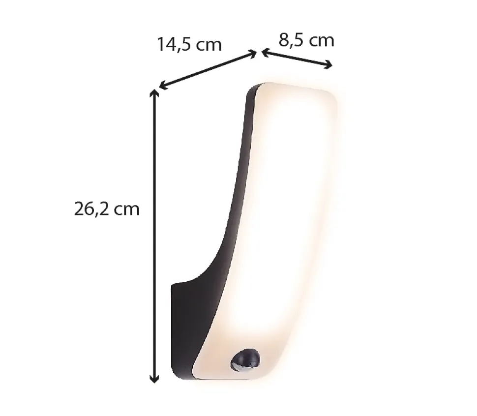 Applique extérieure Kuta + détecteur de mouvement. Couleur(s) : noir. Classe énergétique A++. Matériau : aluminium. Puissance : 24W. Intensité lumineuse : 1600lm. Température de couleur : 3000K. Indice de protection : IP54. Dimensions : 11 x 9 x 30 cm
