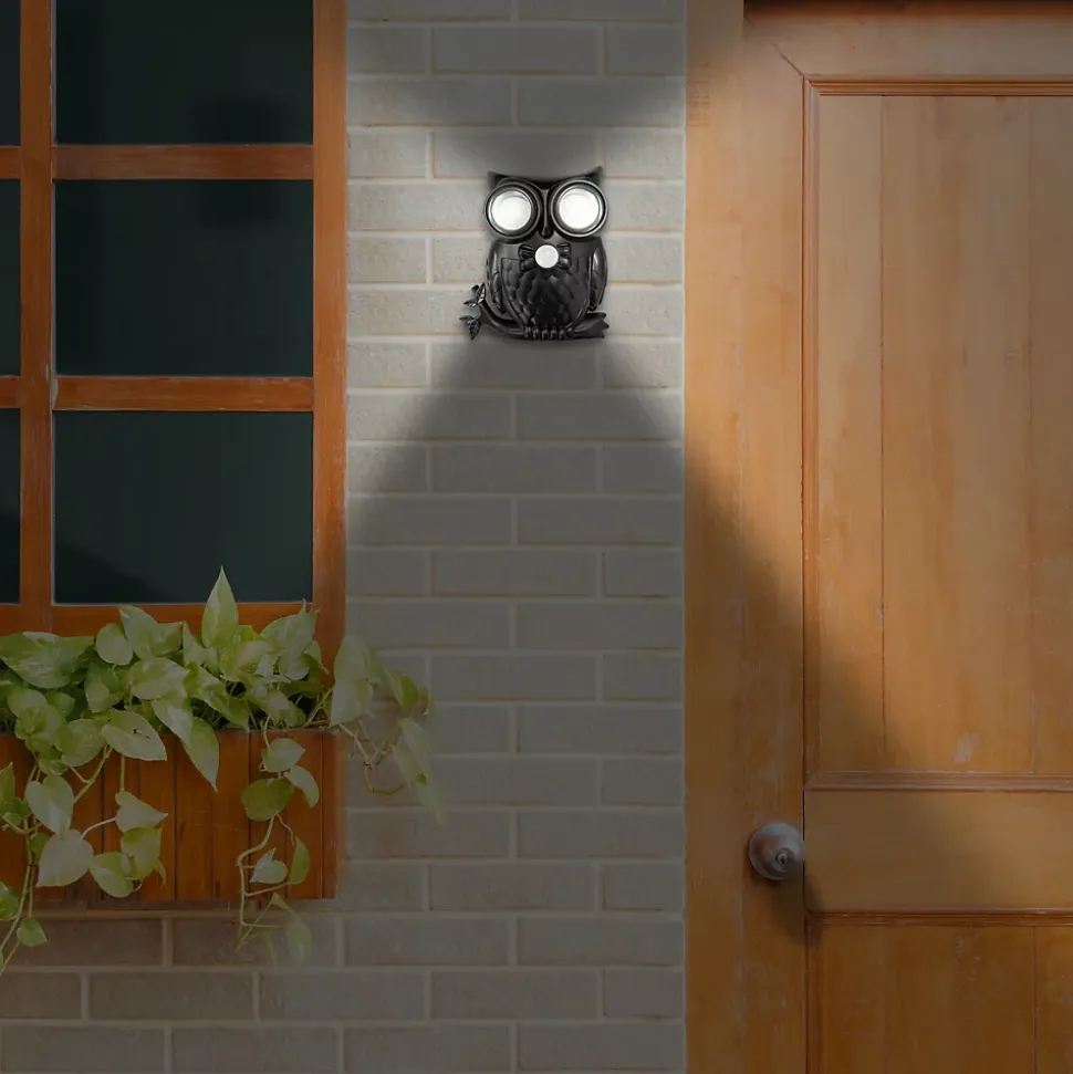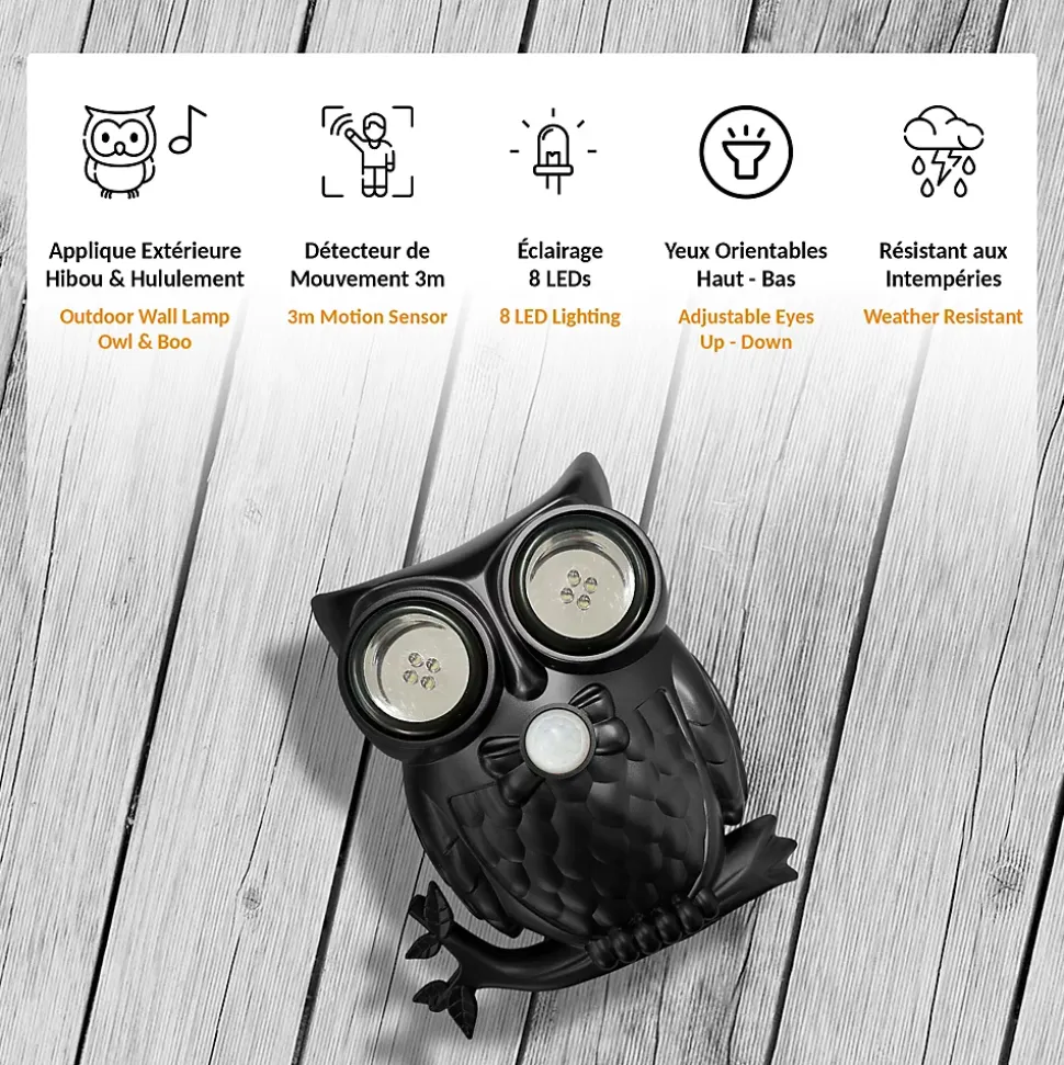 – DÉTECTEUR – Grâce à son détecteur de mouvement, ce drôle de hibou détecte tout mouvement à une distance d’environ 3 mètres. – SONORE – Lorsqu’un mouvement est détecté, les deux yeux s’éclairent et le hibou hulule. Le son peut être désactivé si vous ne souhaitez pas être gratifié d’un hululement à chaque passage ! – ORIENTABLE – Les yeux orientables verticalement permettent d’orienter le l’applique selon votre besoin. – RÉSISTANTE – Résistante aux intempéries (IP44), cette applique est idéale pour éclairer un pas de porte par exemple. – PRATIQUE – Cette applique extérieur peut être posée ou fixée au mur.