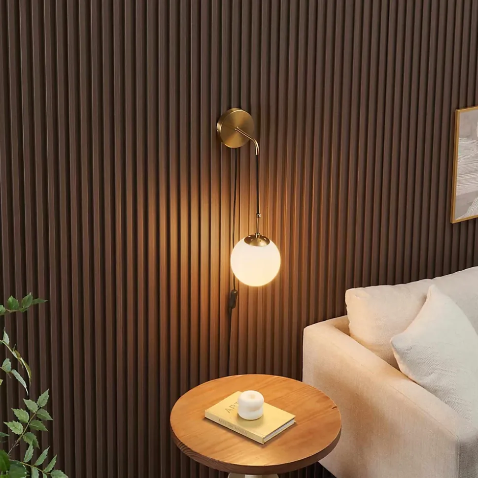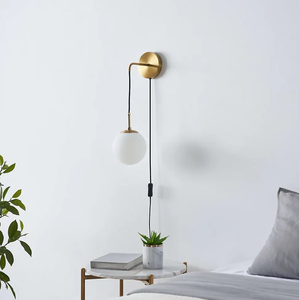 Élégante et minimaliste, Robyn mêle harmonieusement métal doré, câble noir et verre blanc opale. Le globe suspendu accueille une ampoule E27 (non fournie) pour un éclairage chaleureux. Grâce à son interrupteur intégré, cette applique chic et fonctionnelle s’adapte parfaitement à une tête de lit ou un coin lecture raffiné.) Assemblage simple requis (