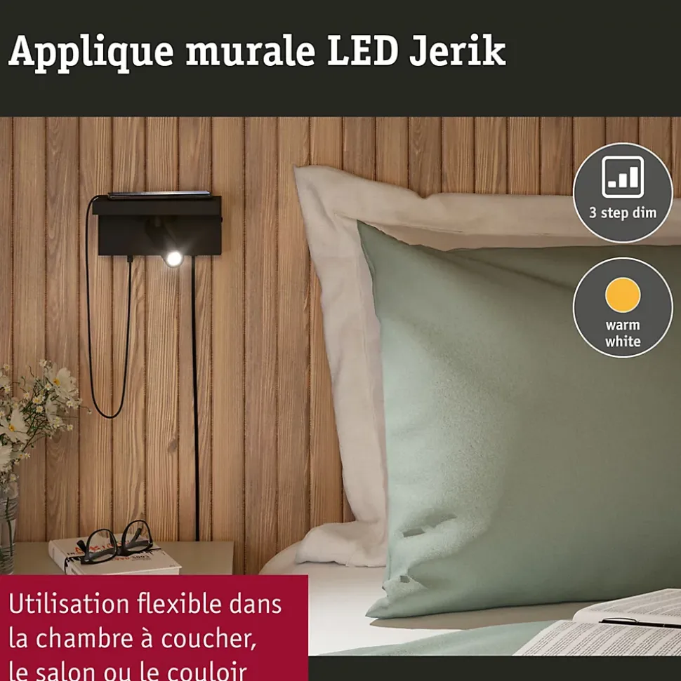 La liseuse murale Jerik en Noir mat avec étagère et fonction de chargement intégrée USB-C est multifonctionnelle et allie technologie de pointe et élégance. Elle convient à merveille comme éclairage supplémentaire et éclairage de lecture dans les séjours et les chambres, ainsi que dans les couloirs et les cuisines. Avec une température de couleur de 3 000K, le luminaire diffuse une lumière blanc chaud chaleureuse. La tête orientable du luminaire permet un éclairage ciblé et assure un éclairage ponctuel – idéal pour lire sans éclairer toute la pièce. Grâce à l’ampoule LED intégrée, le luminaire est gradable sur 3 niveaux selon les besoins et s’adapte ainsi aux souhaits de chacun. De plus, la lampe de lecture murale dispose d’un port de chargement USB-C qui permet un chargement plus rapide grâce à une simple connexion selon la norme européenne la plus récente. Grâce au câble textile de 1,20 m de long doté d’une prise, le montage du raccordement électrique est simplissime. Il suffit d’avoir une prise à proximité. Un raccordement direct à la sortie de courant est également possible grâce au câble textile amovible.