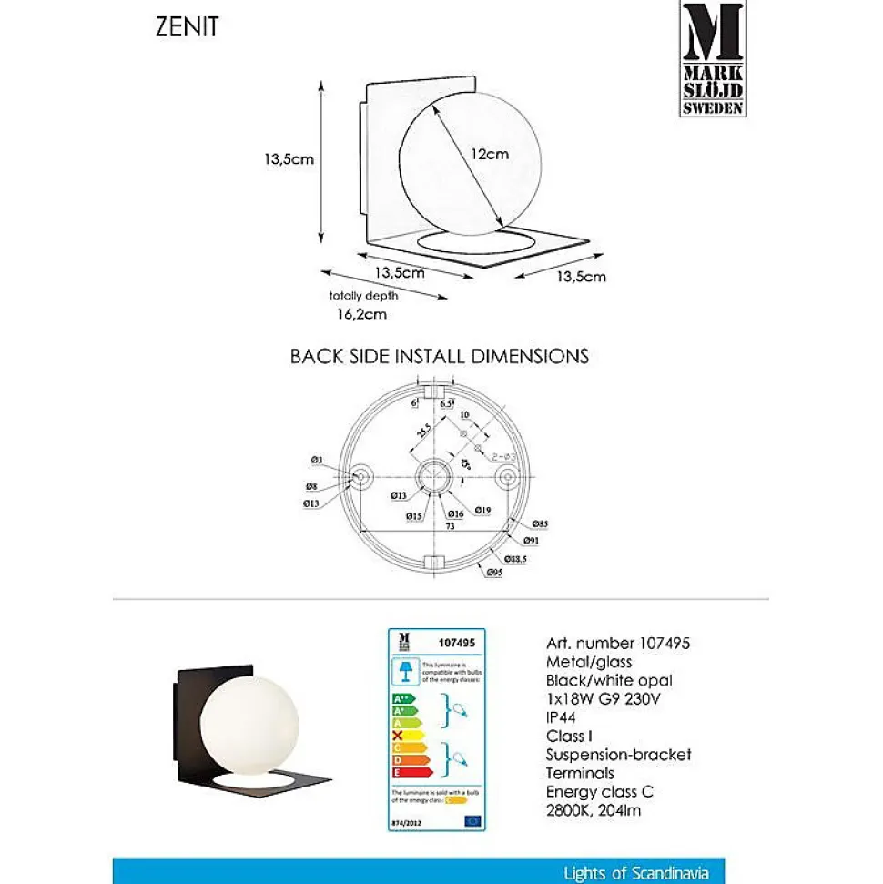 Les caractéristiques techniquesCette applique murale est en métal noir avec un globe en verre opalin.Elle fonctionne avec une ampoule G9, non fournie ce qui vous permet de choisir température de couleur et intensité lumineuse en fonction de vos goûts et besoins.Son IP (indice de protection) 44 lui confère une étanchéité suffisante pour être installée en toute sécurité dans une pièce d’eau.Les avantages esthétiquesJoakim Thedin, designer réputé de Mark Slöjd a conçu pour vous Zenit, objet éclairant au design sobre et épuré et aux finitions haut de gamme. De plus, Zenit est étanche et peut donc être installée en applique murale dans une pièce d’eau.Elle est constituée d’une structure en métal noir et d’une une sphére en verre opalineZenit s’harmonise parfaitement avec une décoration moderne, contemporaine ou industrielle.Vous pourrez l’installer en applique murale dans votre pièce à vivre, votre entrée, votre chambre ou votre salle de bain.