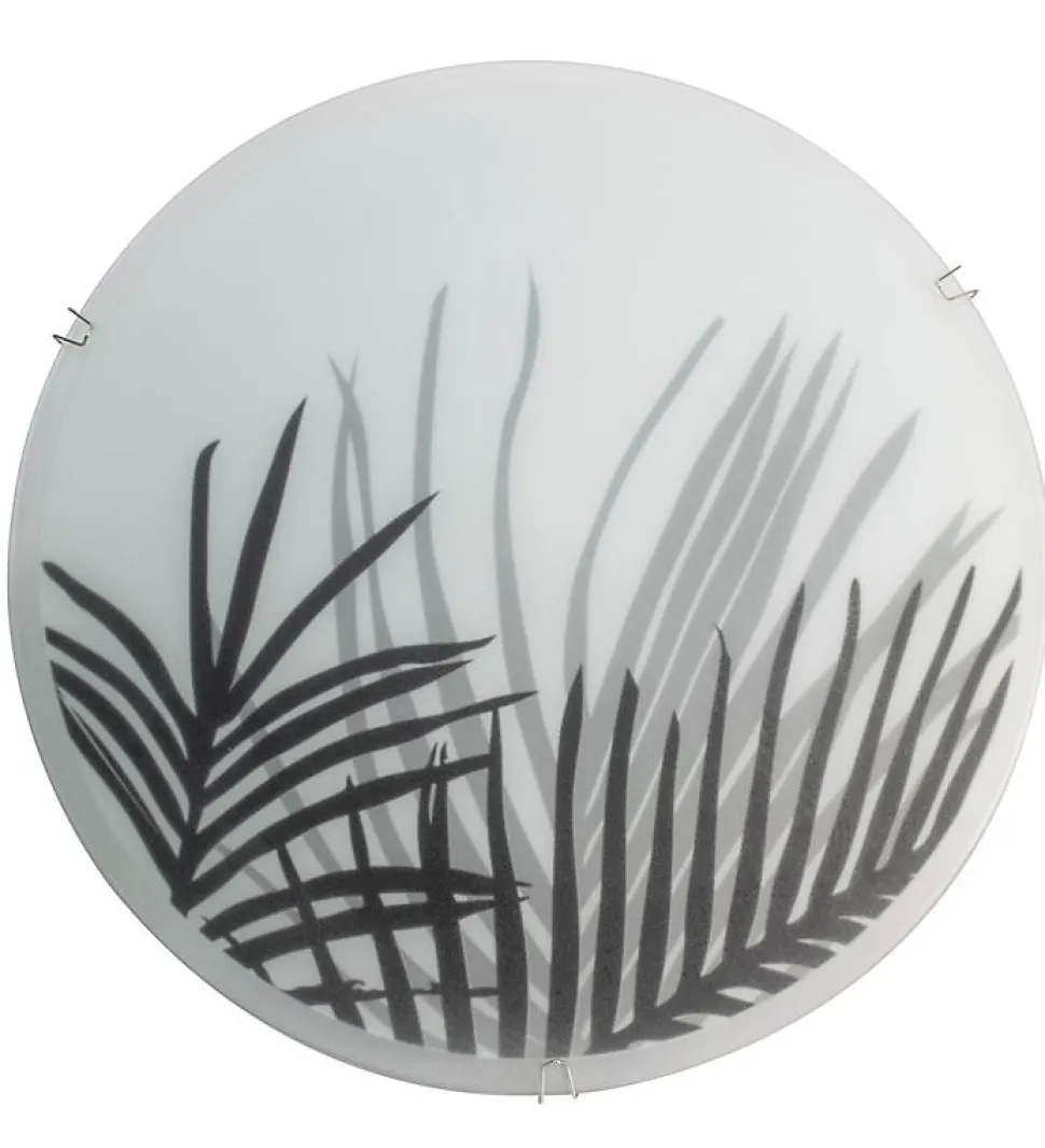 Luminaire plafonnier ou applique mural en verre avec motifs feuillages exotiques(Ampoule non incluse)Ce luminaire en verre motifs feuillages sera idéal si vous souhaitez un éclairage proche du plafond ou du mur et alliant design et excellent rendu lumineux. Ce plafonnier lumineux trouvera parfaitement sa place dans votre salon, bureau, chambre ou toute autre pièce de votre habitation. Il se compose d?une structure en métal et d’un verre diffuseur teinté blanc et gris.Descriptif : Poids de l’article : 715 gCouleur : BlancMatériau : VerreUsages spécifiques : Usage intérieur uniquementDimensions (cm) : Diametre 30 – Hauteur 10 cmCaractéristiques techniques :Type d’ampoule compatible : Fluorescente Compacte (CFL)Type de culot : E27Ampoule incluse : NonPuissance : 11 WattsVolt : 230 VBranchement : électriqueKit et Notice d’installation fournisAdoptez ce luminaire plafonnier en verre design pour éclairer votre salle de bain, cuisine, bureau, chambre ou pièce à vivre. Avec sa forme ronde et peu encombrante, ce plafonnier sera parfait si vous êtes à la recherche d’un luminaire pour plafond bas.