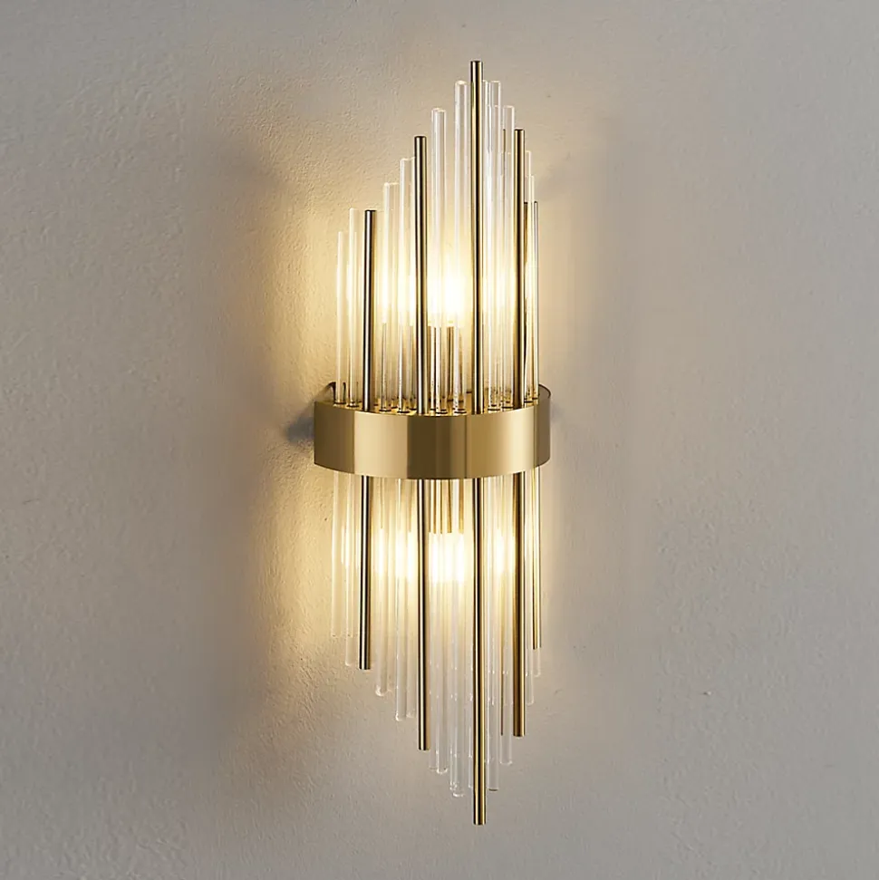 L’applique murale Dania, avec sa finition dorée, est une pièce exceptionnelle qui marie à la perfection design et praticité. Ses tiges en verre transparent apportent une lumière diffuse et élégante, idéale pour créer une atmosphère chaleureuse. Grande et imposante, elle transforme instantanément votre mur. Ce modèle doit être complété par 2 ampoules E14.) Assemblage à faire par vos soins (
