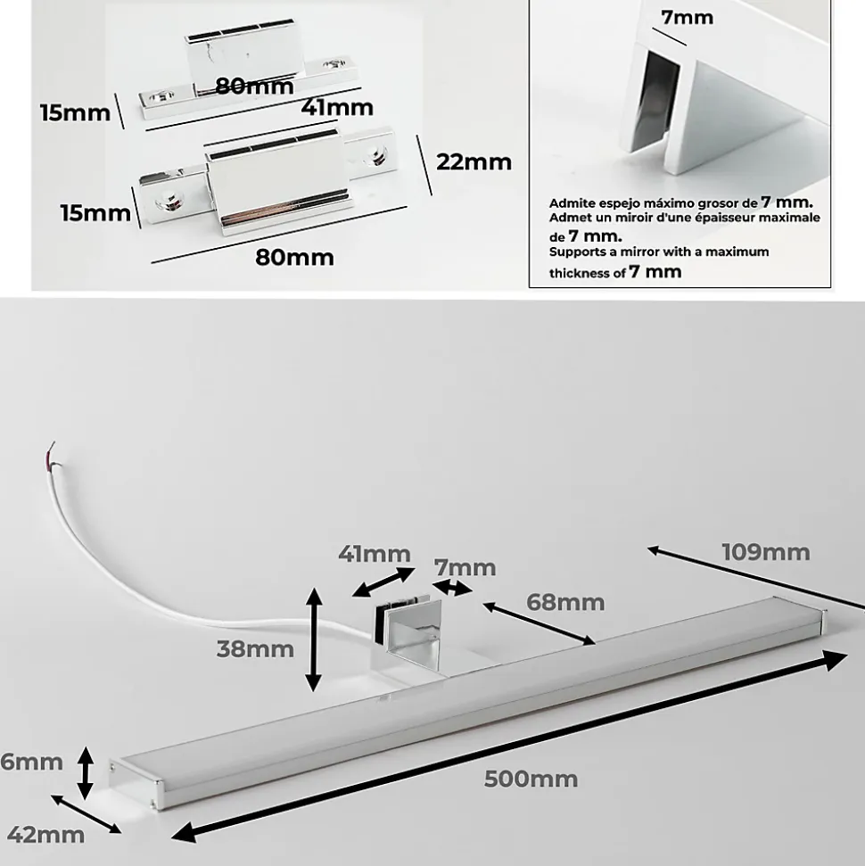Applique LED pour miroir de salle de bain – 50 cm, 12W, 1260 lm, IP44, installation polyvalente (miroir, meuble ou mur) Cet applique LED de 50 cm de large offre un éclairage puissant, uniforme et fonctionnel, idéal pour des tâches comme le maquillage, le rasage ou le lavage. Son design moderne et minimaliste en fait une solution parfaite pour les salles de bain contemporaines. Grâce à sa polyvalence d’installation, il peut être installé sur le miroir, sur des meubles ou directement sur le mur. Fabriqué en aluminium et en polycarbonate de haute qualité, il est résistant à l’humidité, aux éclaboussures d’eau, à la poussière et à la saleté, grâce à sa protection IP44, ce qui le rend particulièrement adapté aux environnements de salle de bain. Caractéristiques principales : Dimensions : 50 cm de largeur (500 x 112 x 44 mm) Puissance : 12W – 1260 lumens Température de couleur : 4000K (blanc neutre) CRI > 80 : Haute fidélité des couleurs Protection IP44 : Résistant à l’humidité et à la poussière Angle d’ouverture : 120° Installation rapide sans transformateur supplémentaire Matériaux : Corps : Aluminium Diffuseur : Polycarbonate / Plastique acrylique résistant Options d’installation (3 en 1) : Sur le miroir : via une fente intégrée à la base. Sur le meuble : fixation par vis avec support horizontal. Au mur : avec support mural inclus. Avantages du produit : Taille idéale de 50 cm pour une couverture optimale sur le miroir. Éclairage LED efficace avec puce SMD2835. Design moderne et discret qui s’adapte à toutes les salles de bain. Lumière claire et uniforme, idéale pour une utilisation quotidienne. Installation facile avec tous les accessoires inclus. Parfait pour être placé au-dessus du miroir et profiter d’un éclairage intense, clair et à faible consommation.