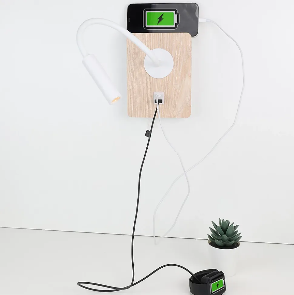 Applique murale LED MULAN avec port USB Type C et lumière de lecture blanc chaud Description longue Lapplique murale MULAN combine élégance et fonctionnalité pour offrir une solution idéale à la fois pour la lecture nocturne et pour charger vos appareils mobiles. Avec son bras flexible orientable et son port USB intégré ainsi quun port de charge Type C cet applique est parfait pour les têtes de lit les tables de chevet et bien plus. Son design moderne et ses matériaux de haute qualité en font un choix pratique et stylé. Caractéristiques principales LED intégrée et orientable Fournit un éclairage précis et dirigé idéal pour la lecture. Surface avant effet bois Apporte une touche esthétique et durable à votre espace. Port USB et Type C Chargez vos appareils mobiles facilement et rapidement. Interrupteur individuel intégré Un contrôle simple et pratique pour allumer ou éteindre lapplique. Support intégré Pour poser des objets décoratifs ou des appareils mobiles de manière pratique. Fiche technique Matériaux Bois et aluminium Puissance LED 3W Température de couleur Blanc chaud 2800K Dimensions 130 x 170 x 455 mm IP20 Pour usage intérieur Cet applique MULAN est le choix parfait pour ceux qui recherchent à la fois fonctionnalité et design dans leur espace.