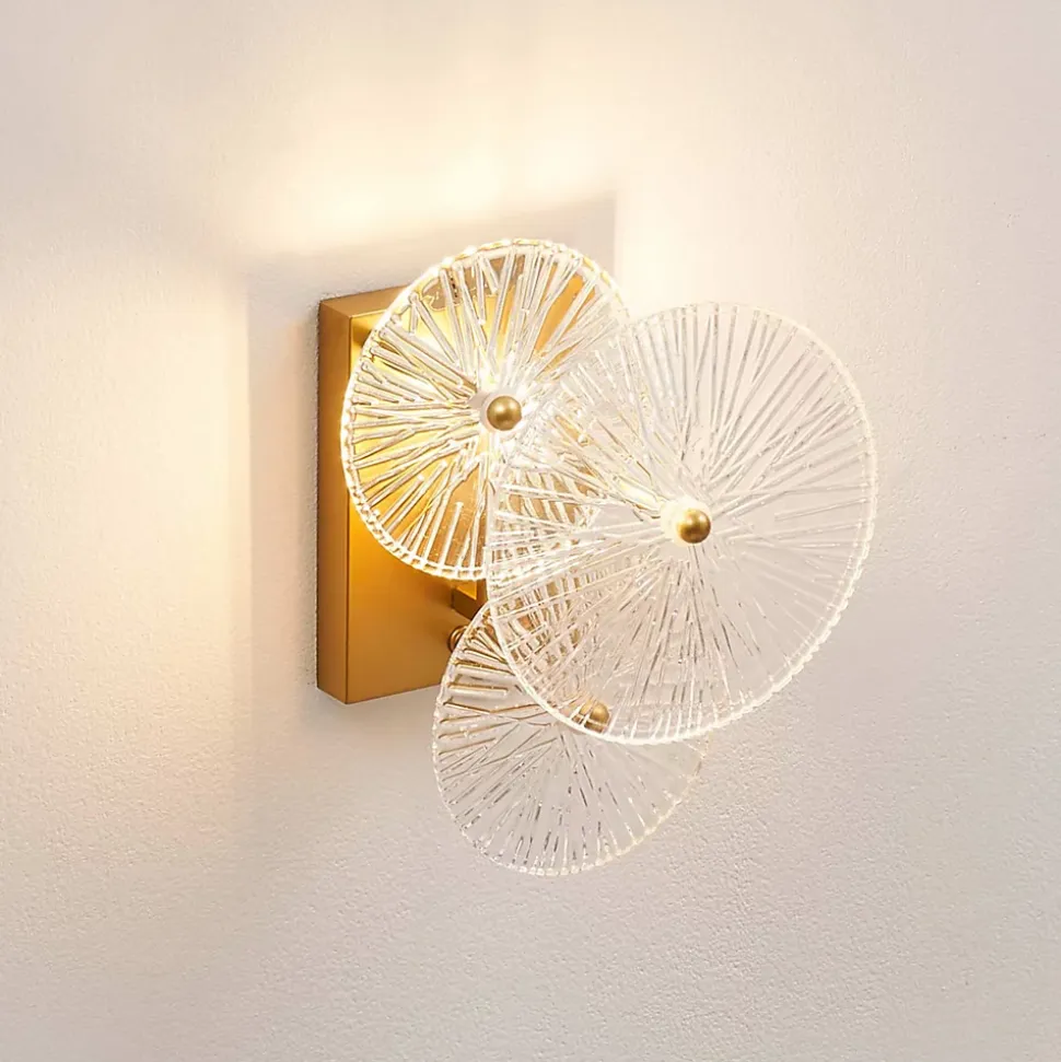 Emilia est une applique murale dorée, composée d’un socle à la finition brillante et de trois disques en verre. Les disques, ornés de fines stries, diffusent de superbes reflets muraux lorsque l’applique est allumée. Fonctionnant avec une ampoule E14 (non fournie), cette pièce raffinée s’intègre parfaitement dans un intérieur moderne. Pour une cohésion parfaite, Emilia peut être combinée avec le plafonnier de la même gamme.) Assemblage simple requis (