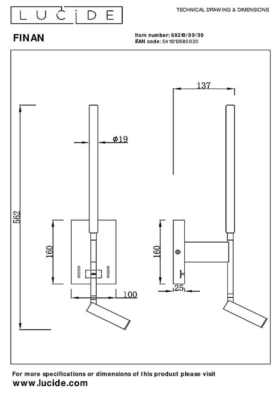 La simplicité a du charme. C’est un dicton bien connu, et pourtant, rien n’est plus vrai. La preuve en est Finan. Cette applique murale compacte arbore un design minimaliste. D’une part, Le tube élancé en aluminium de haute qualité, équipé d’une lampe LED diffusant une lumière blanc chaud. D’autre part, Finan est équipé d’un projecteur discret et orientable qui guide ses flèches vers la cible visée. Vous pouvez allumer et éteindre la lampe facilement grâce à un interrupteur sur l’appareil. Son arme secrète ? L’applique murale Finan est dotée d’un port USB. Ainsi, vous pouvez recharger discrètement et en un rien de temps tous vos appareils électroniques.Caractéristiques uniques:• Équipé d’une lampe LED intégrée• Dispose d’une lumière blanche chaude (2700K)• Cette lampe est rotative (verticalement)• Avec un interrupteur On/off sur la lampe• La lampe est munie d’un port USB pour le chargement d’appareils externes (USB-C)Principales caractéristiques du produit:• Consommation énergétique: 1x6W / 230V / Sans intensité variable (Ampoule incluse)• Dimensions: Lon.13,7 x Larg.10 x Haut.56,2 cm• 3 Ans garantie sur le luminairePourquoi choisir l’éclairage Lucide?Lucide incarne un design innovant, un savoir-faire artisanal et une fiabilité exemplaire. En tant qu’entreprise familiale belge avec plus de trois décennies d’expertise, nous concevons des éclairages de haute qualité qui enrichissent et transforment chaque espace, tant intérieur qu’extérieur. Notre collection polyvalente comprend des luminaires durables et des sources lumineuses économes en énergie, soigneusement conçus par nos propres experts et fabriqués selon les normes CE les plus strictes. Grâce à notre large gamme, nous vous proposons toujours une solution d’éclairage adaptée, quel que soit le style ou l’espace. Ainsi, nous illuminons non seulement votre espace de vie mais aussi votre processus de choix dans la recherche d’un é…