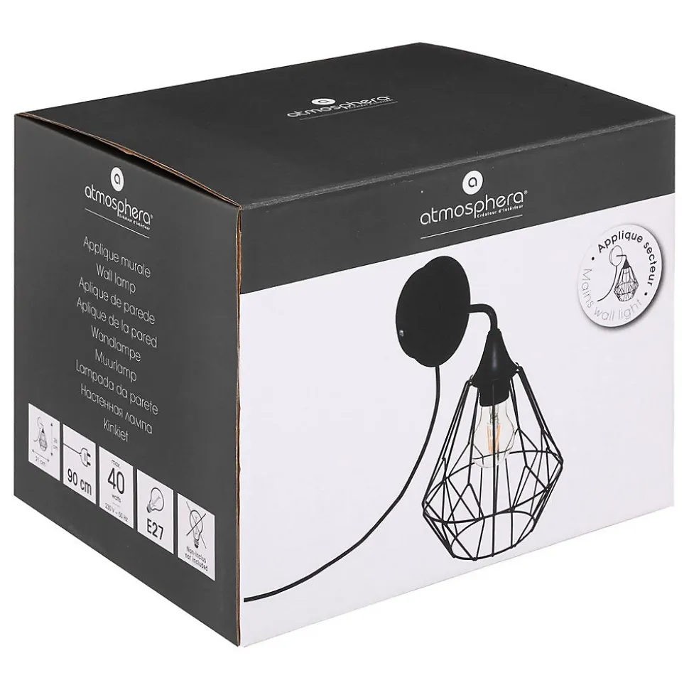 L’applique murale « Flave » Atmosphera diffusera une jolie lumière dans votre intérieur.Une lampe polyvalenteVéritable objet déco, l’applique murale « Flave » s’adaptera à toutes les pièces de votre maison. Dans un salon, une chambre ou un bureau, elle propagera une ambiance chaleureuse et agréable.Un design moderne et sobreLa structure en métal filaire de ce luminaire laisse entrevoir l’ampoule. Cette matière robuste lui assure une bonne durabilité. Pour l’entretenir, un coup de chiffon sec de temps en temps est idéal pour éliminer la poussière.Pour bien éclairer un espace, associez l’applique murale « Flave » à une grande suspension Atmosphera.Le petit plus décoChoisissez une ampoule à filaments apparents pour un rendu très convivial.